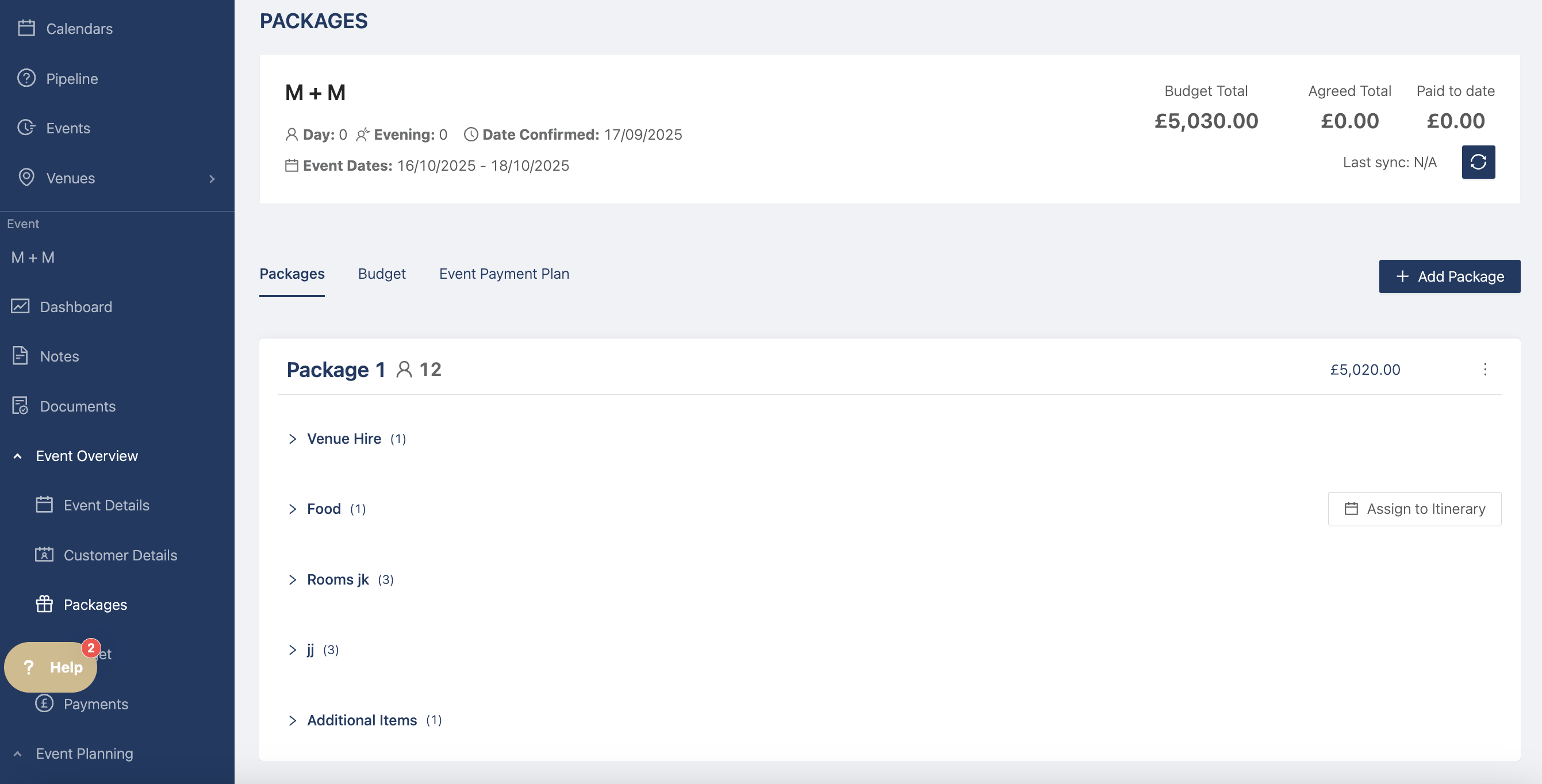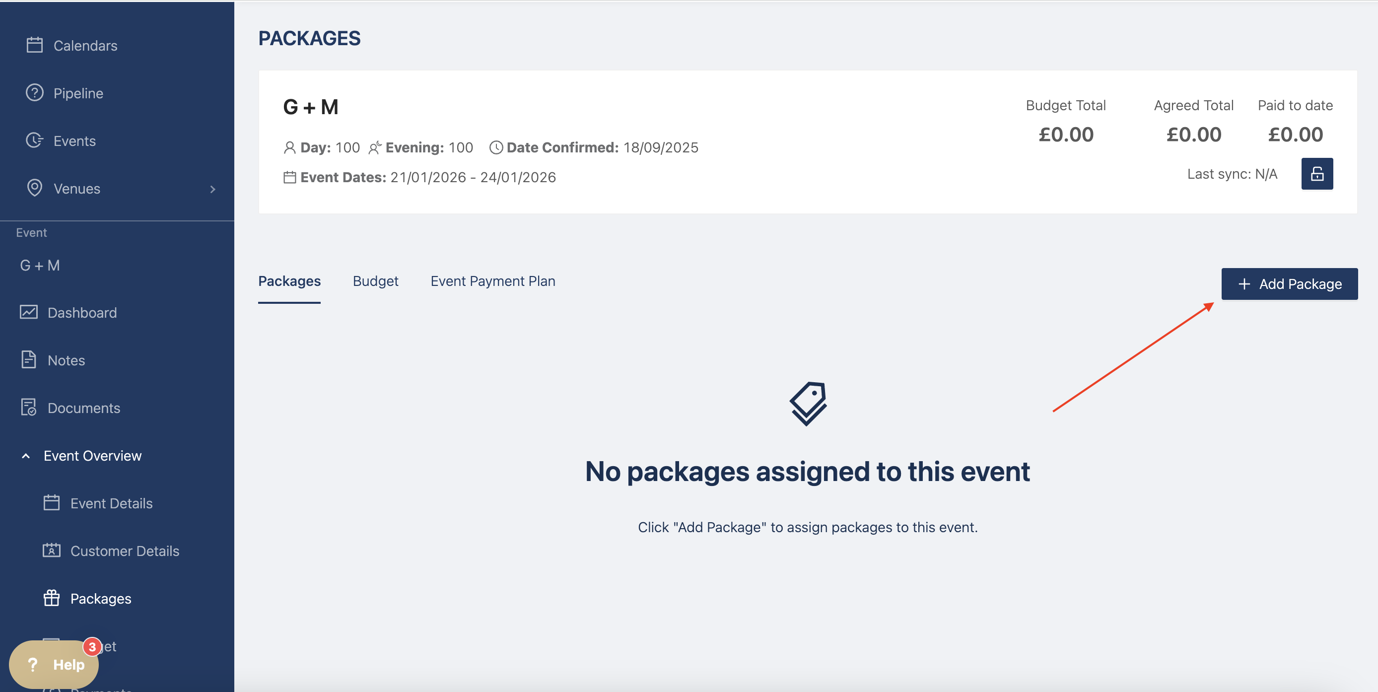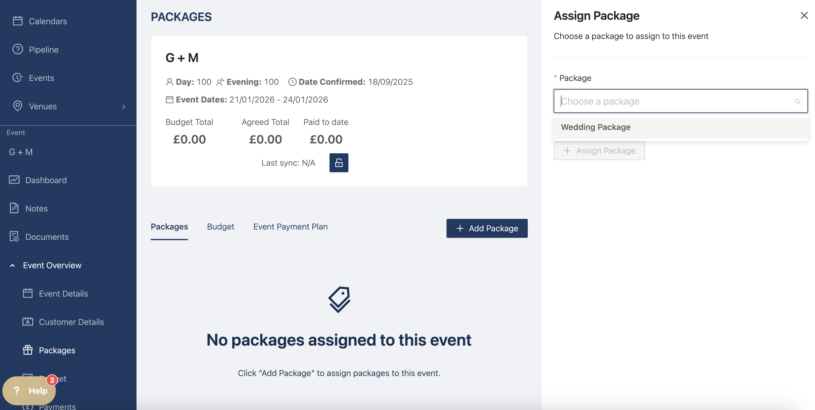 Select the package you want from the drop down. If you're not seeing one of the packages you've created, please double check the booking and event dates you set at venue level.
