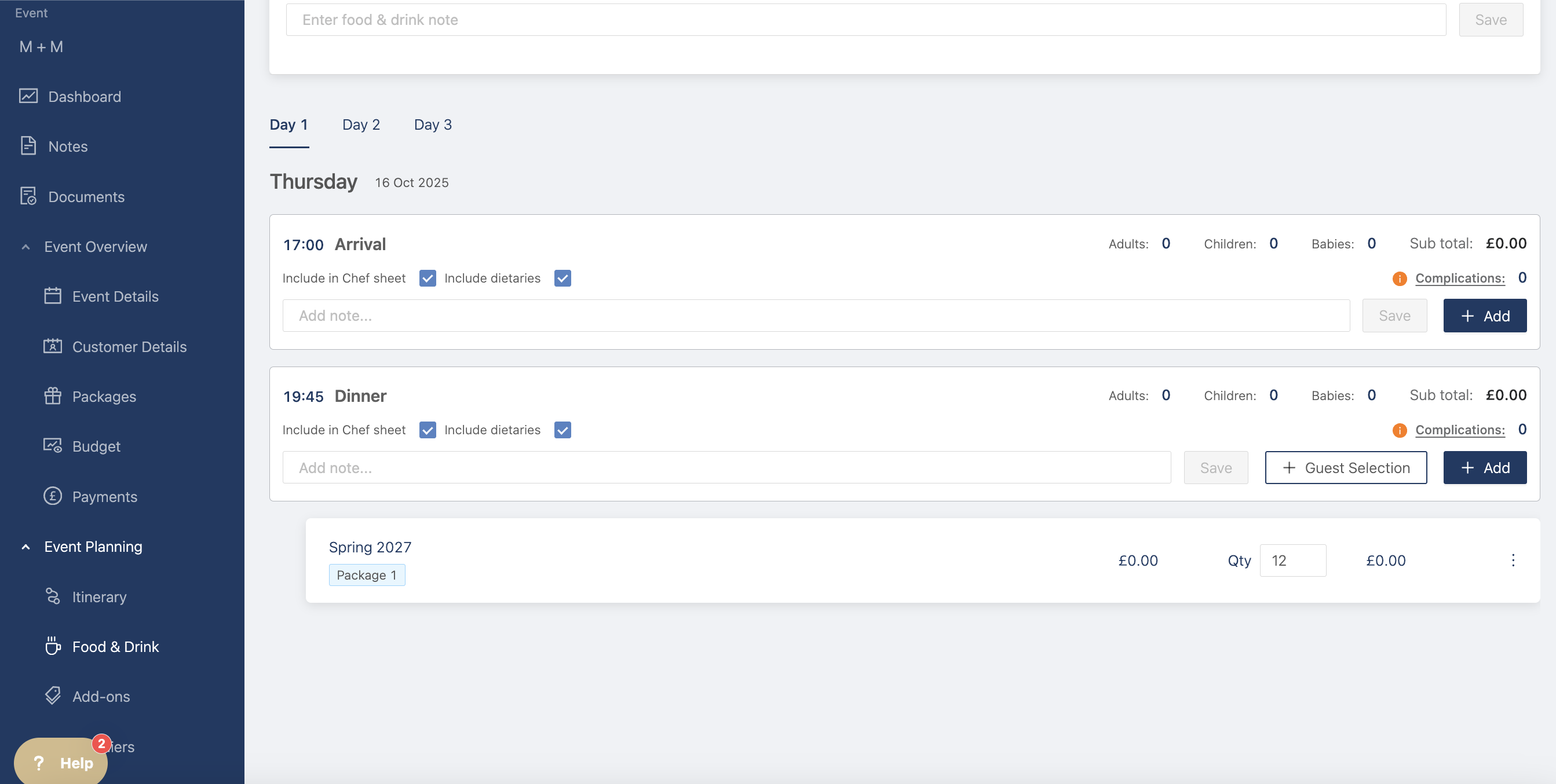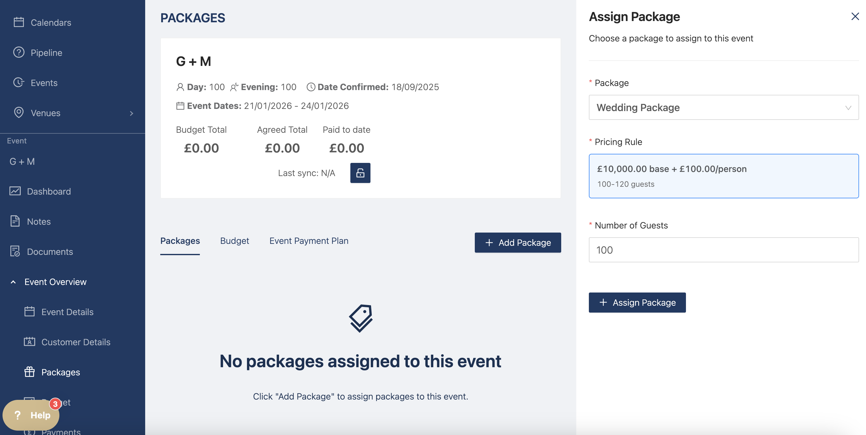 Select the package and add the number of guests. You can always change this if the number changes. Then click on assign