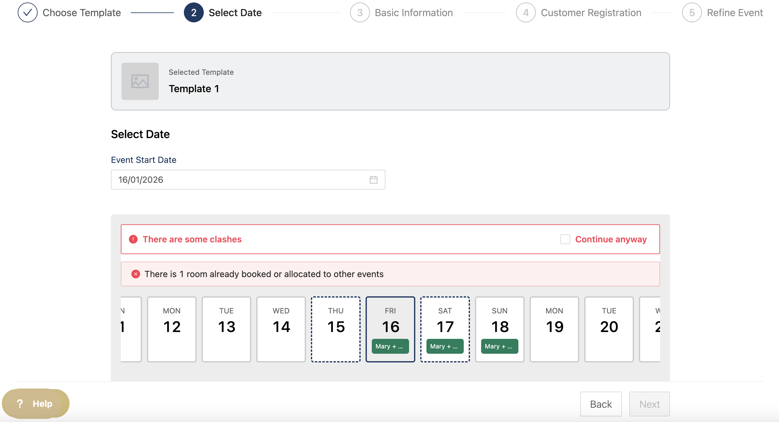 You can then select the date for the event and a calendar will pop up to show you if there are any clashes with other events.