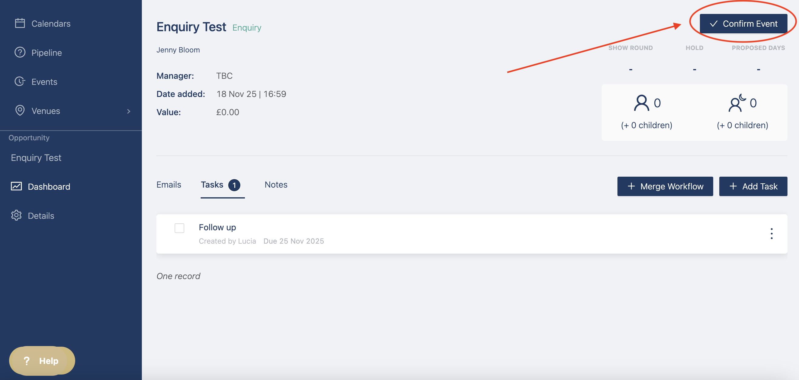 To move an enquiry to the events table all you need to do is click on the confirm event button.