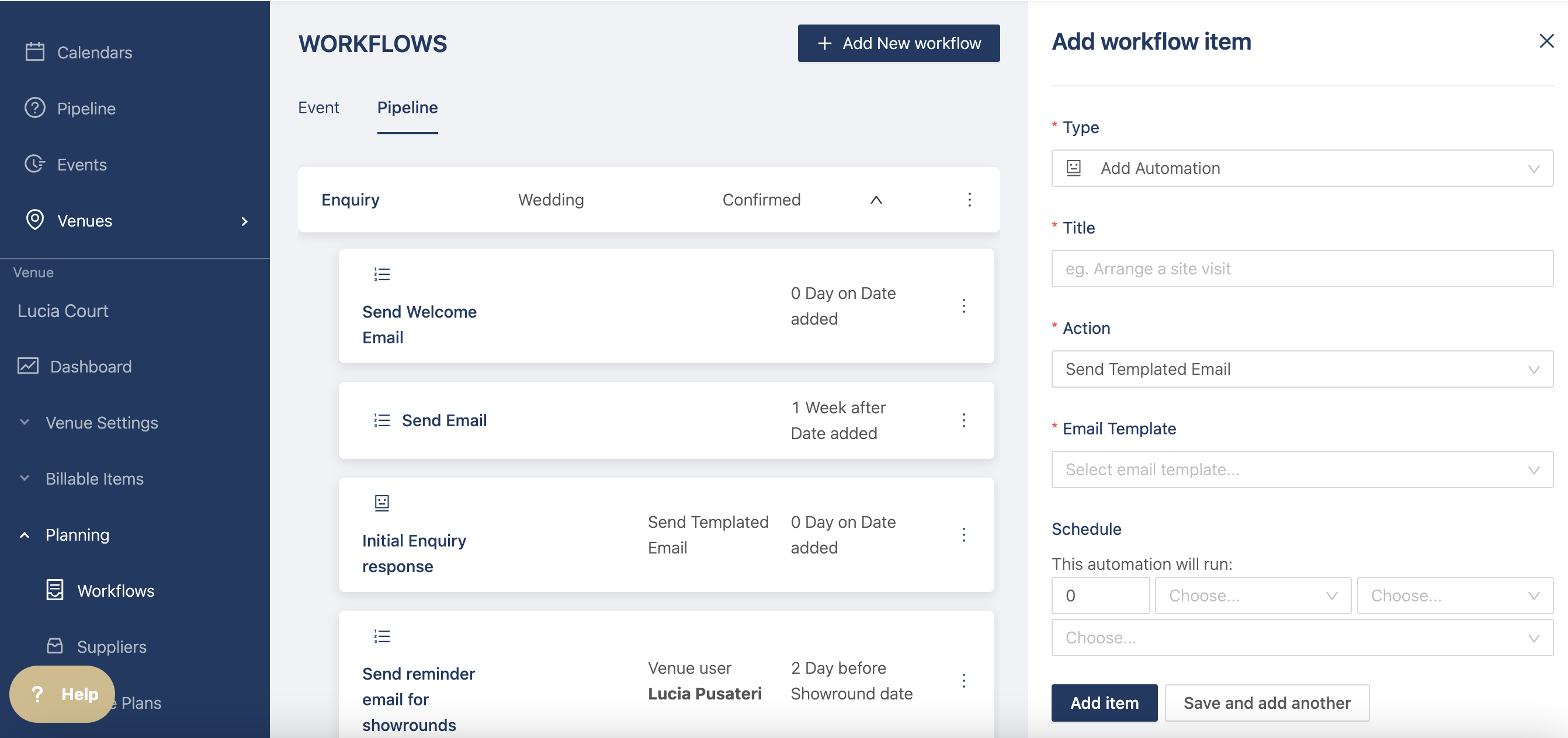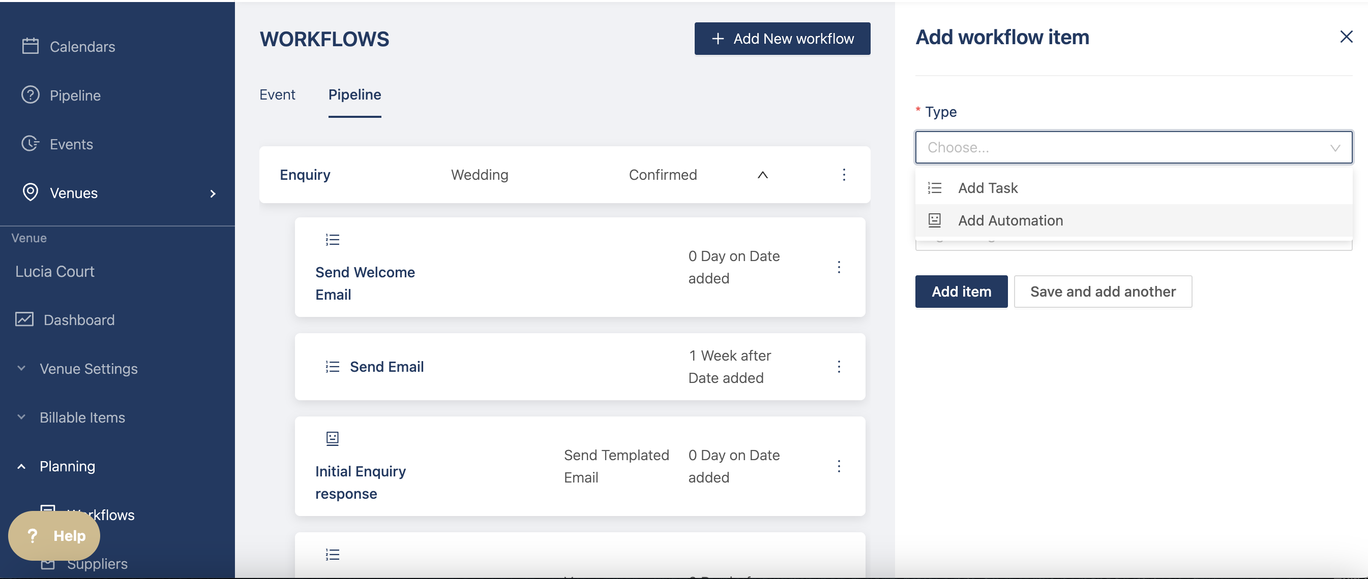- Stay in Event or go to Pipeline and click on 'Add new workflow' to choose the event type and status, name your workflow and add notes.