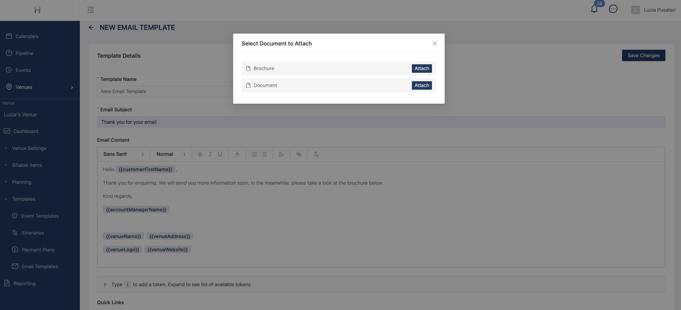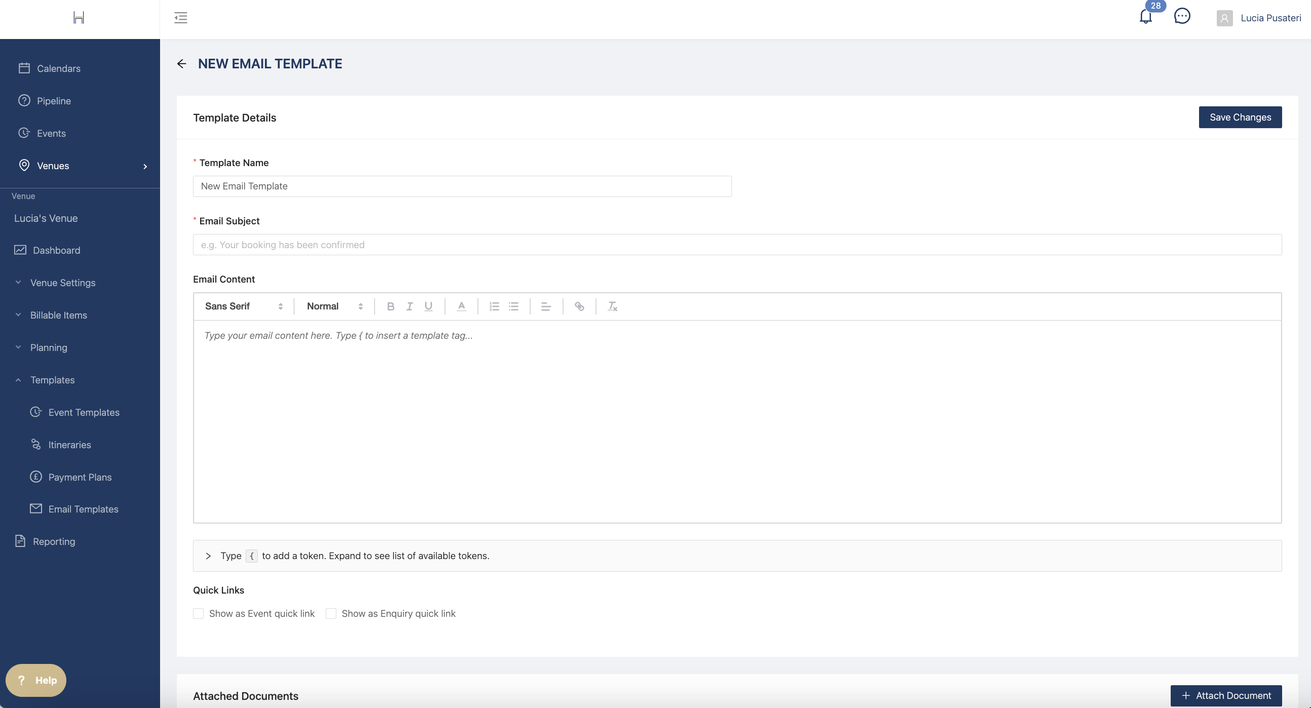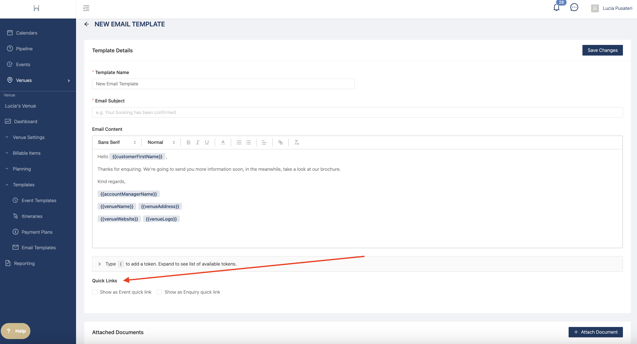 Tick the quick link boxes if you want to quickly select your template in events or enquiries