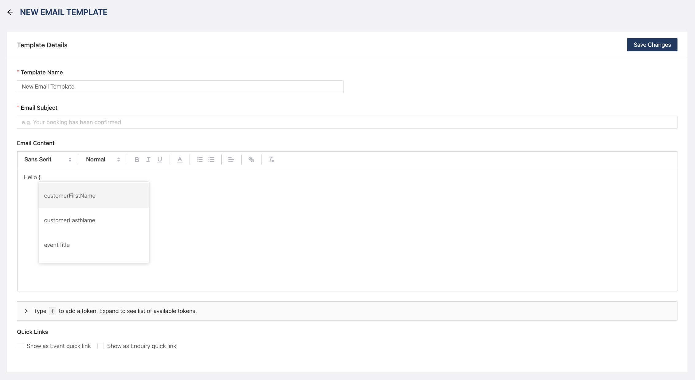 Add a subject line and email content. In the email content, you can add tokens to automatically personalise your emails with the correct customer name, the event title, event dates, and much more.