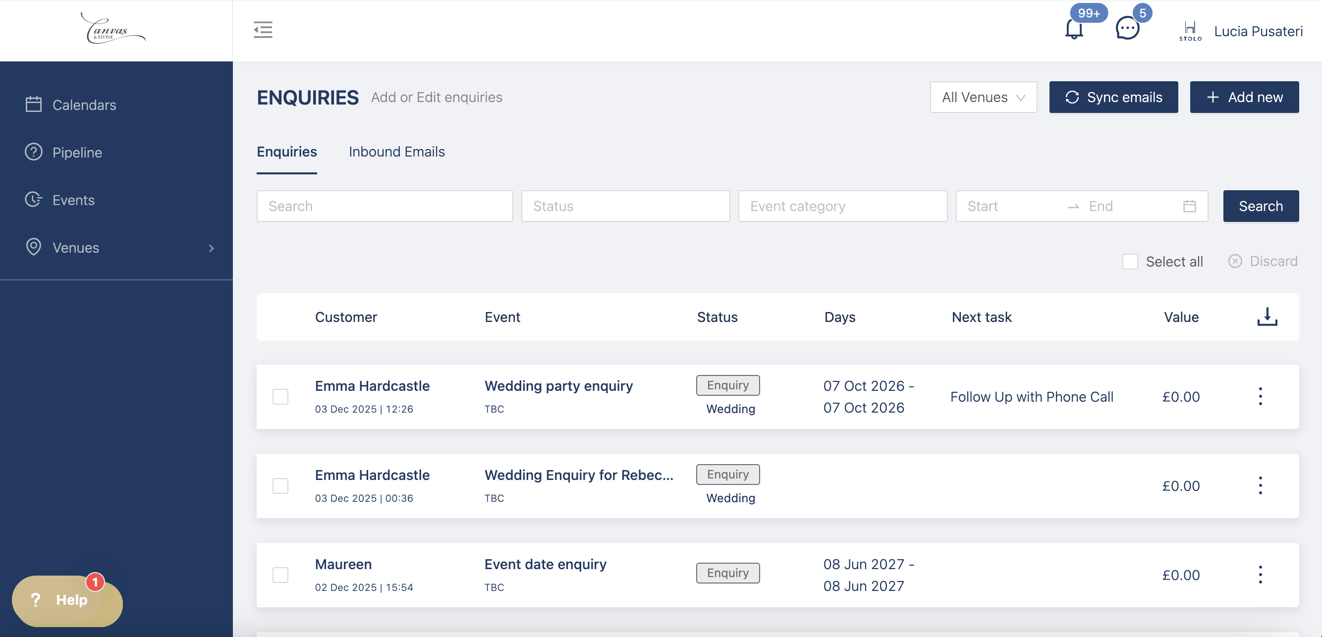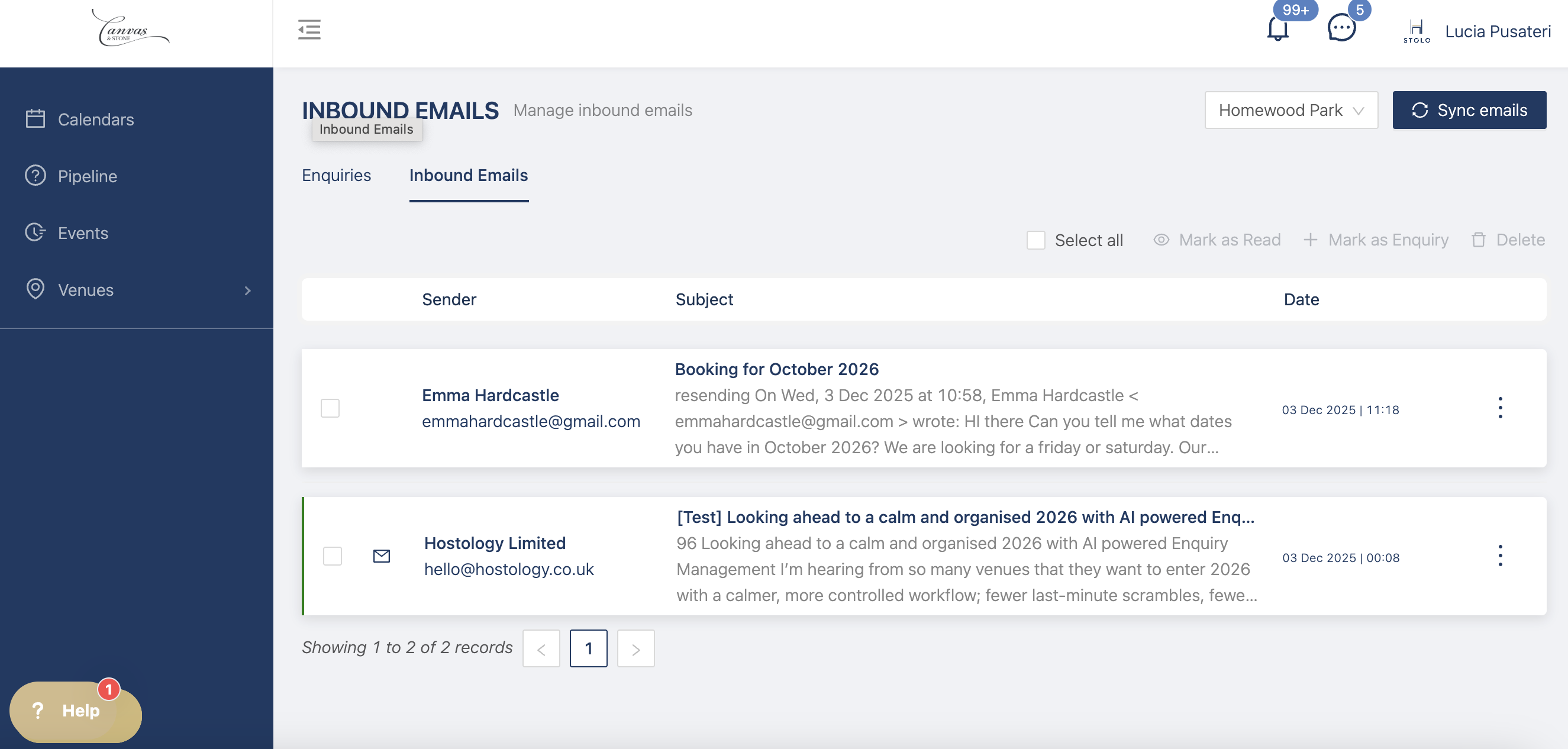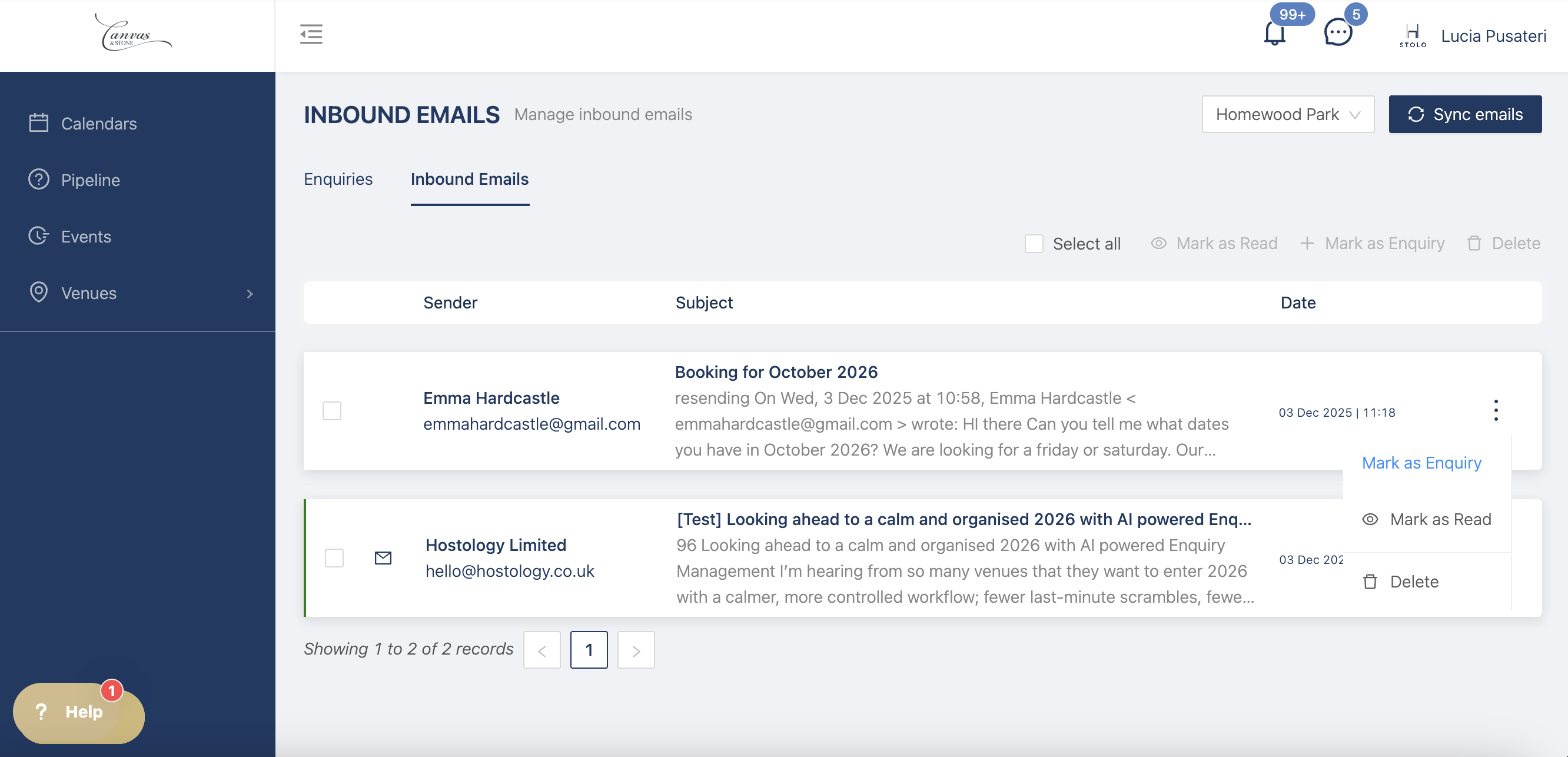 The enquiries has two sections where you can take a look at all of your enquiries and any other emails coming through to your inbox. Our smart AI system automatically filters the emails and adds the correct information in the relevant fields.