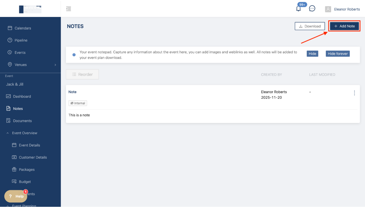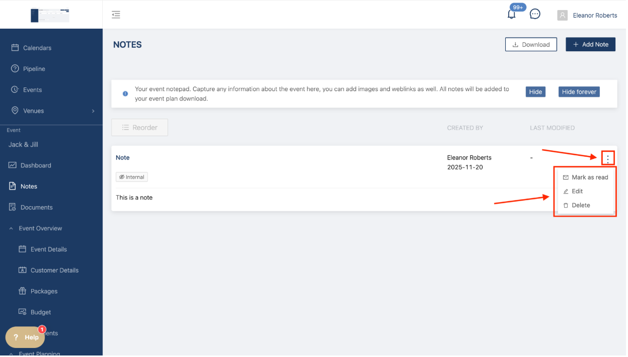 Event notes function like a digital notepad where you can jot down important details that might not fit into other sections of Hostology. This is helpful for various reasons: venues and couples don't need to email back and forth, small pointers / changes can be made, key information can be added to certain parts of the event, etc.