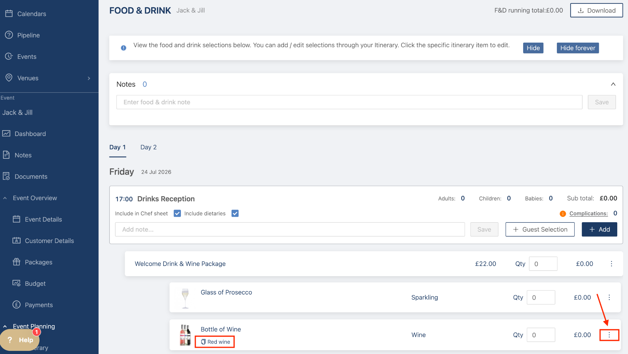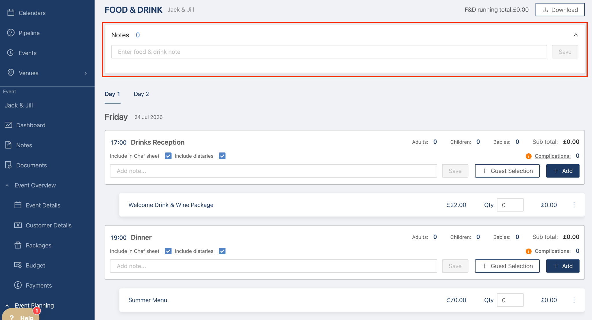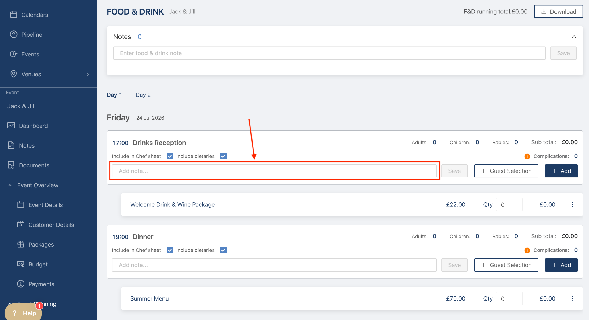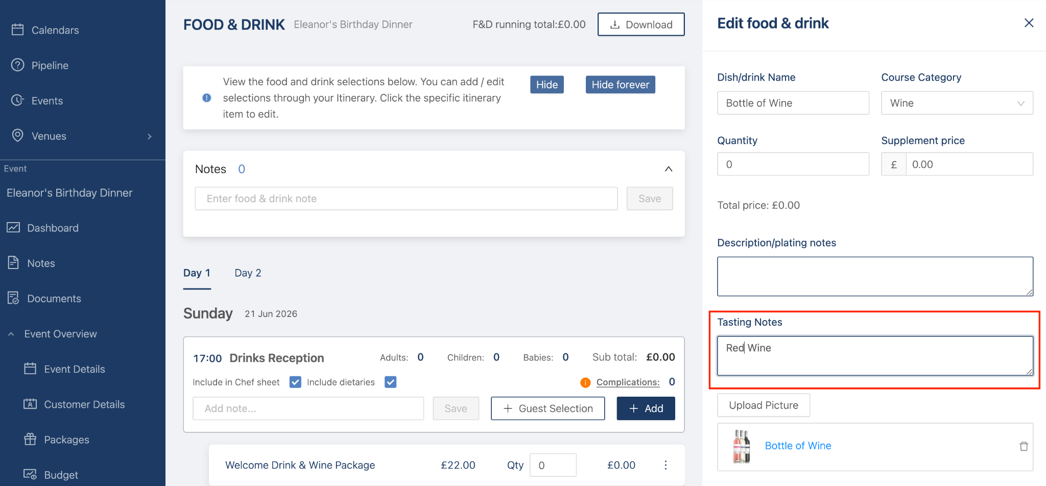 - When in the ‘Food & Drink’ section of your event, you can also add tasting notes to specific meals of the event