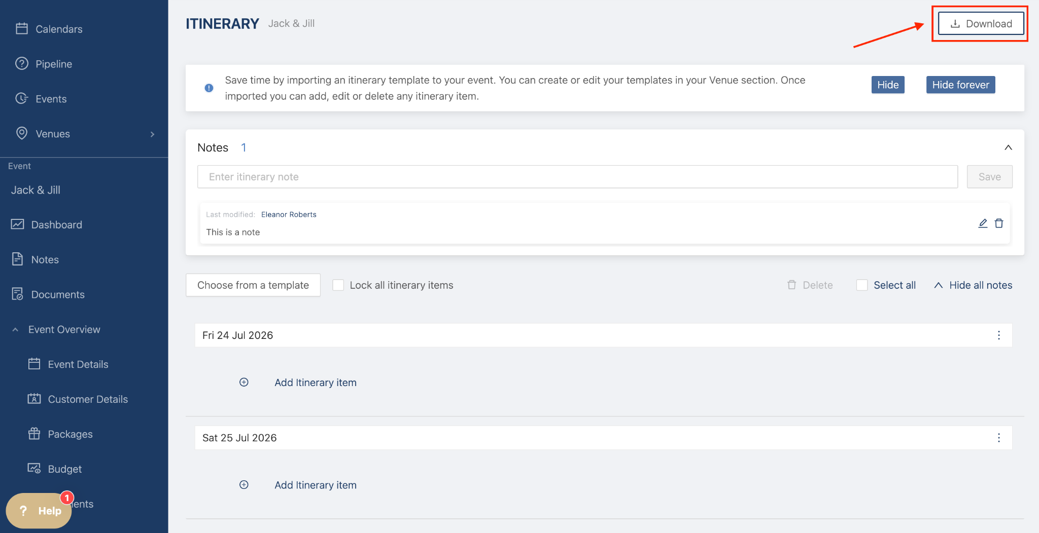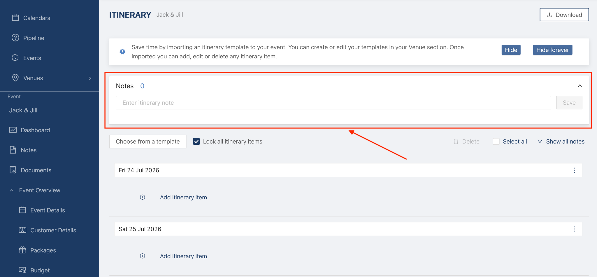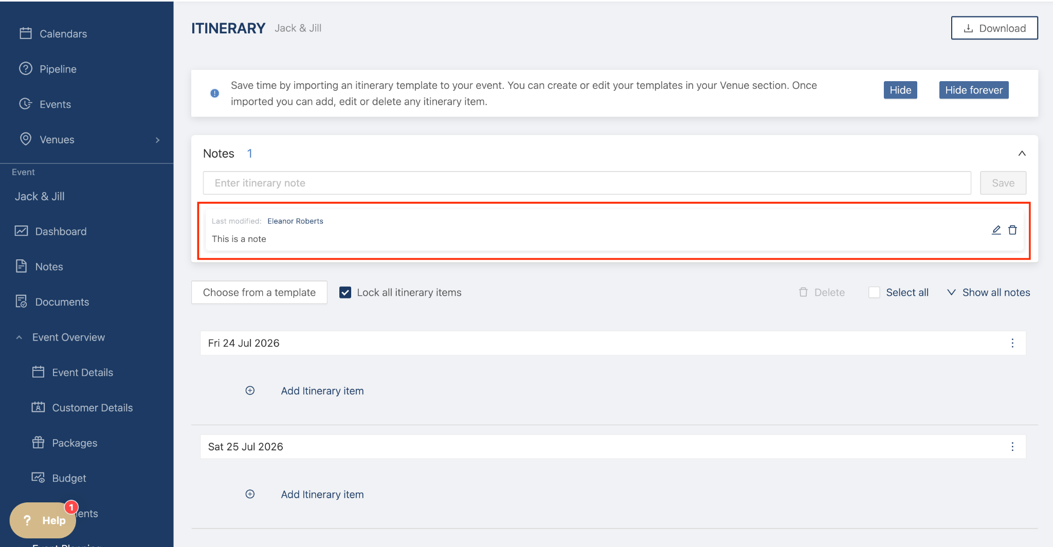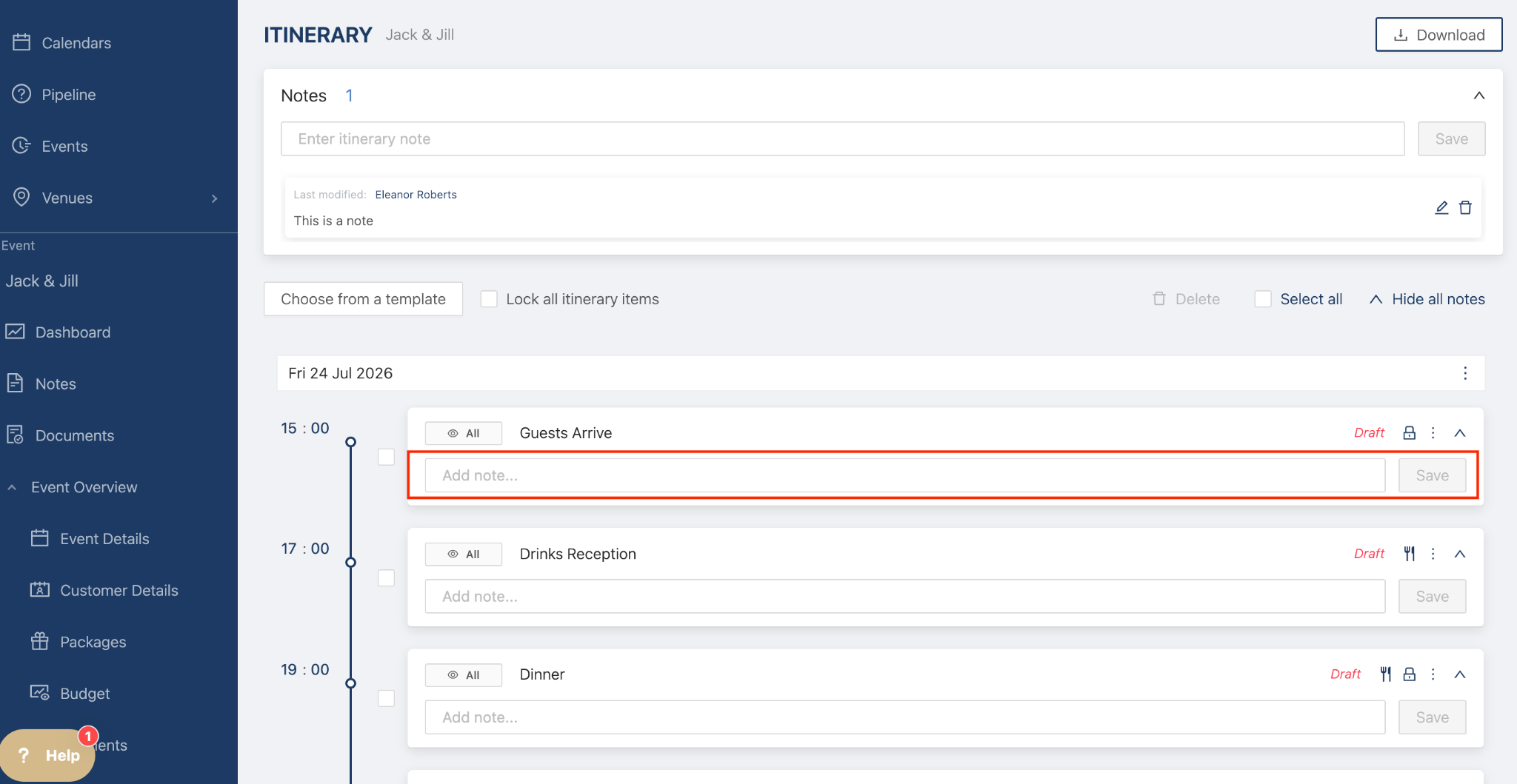 - These notes will appear at the top of the Itinerary PDF when downloading the event plan