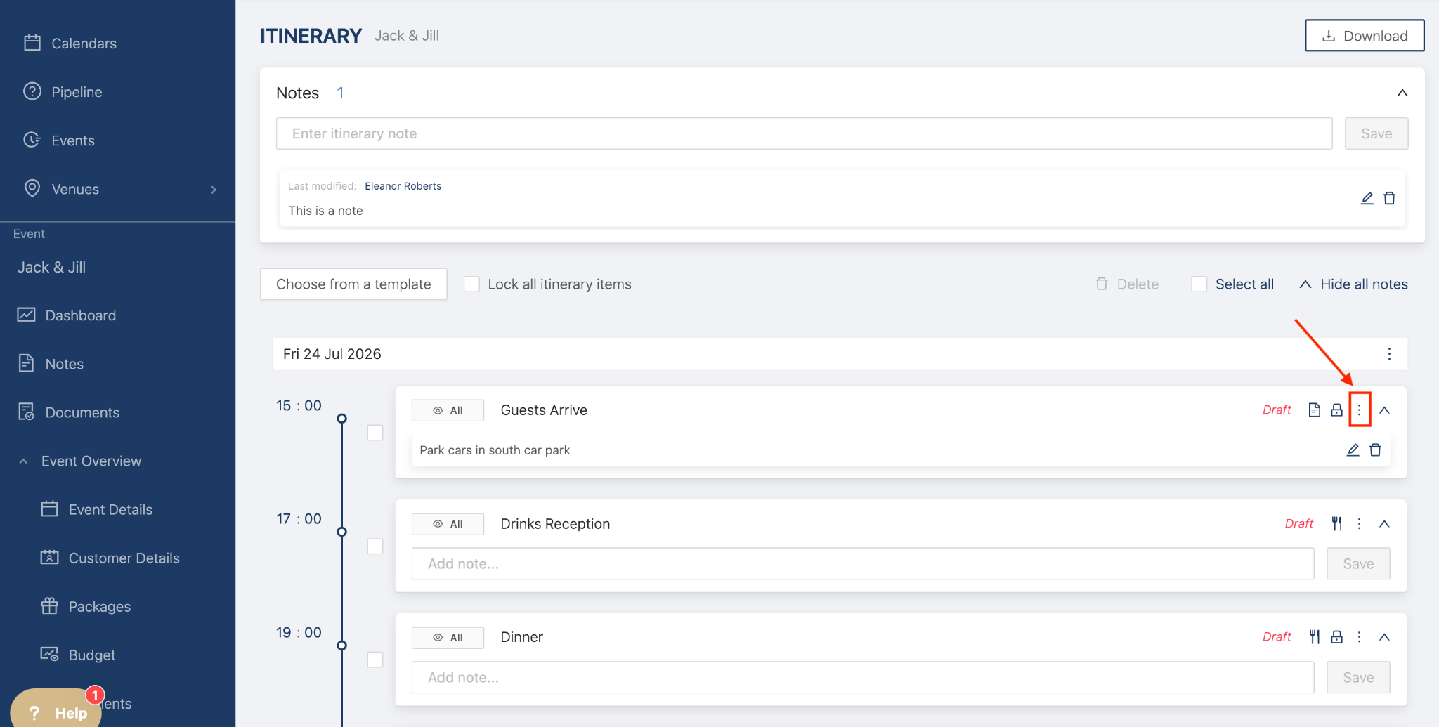 - These notes will appear next to the relevant item in the Food & Drink section when downloading the event plan as a PDF