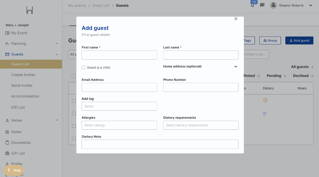 - When adding a guest from the Host Portal, there is an option for adding dietary requirements