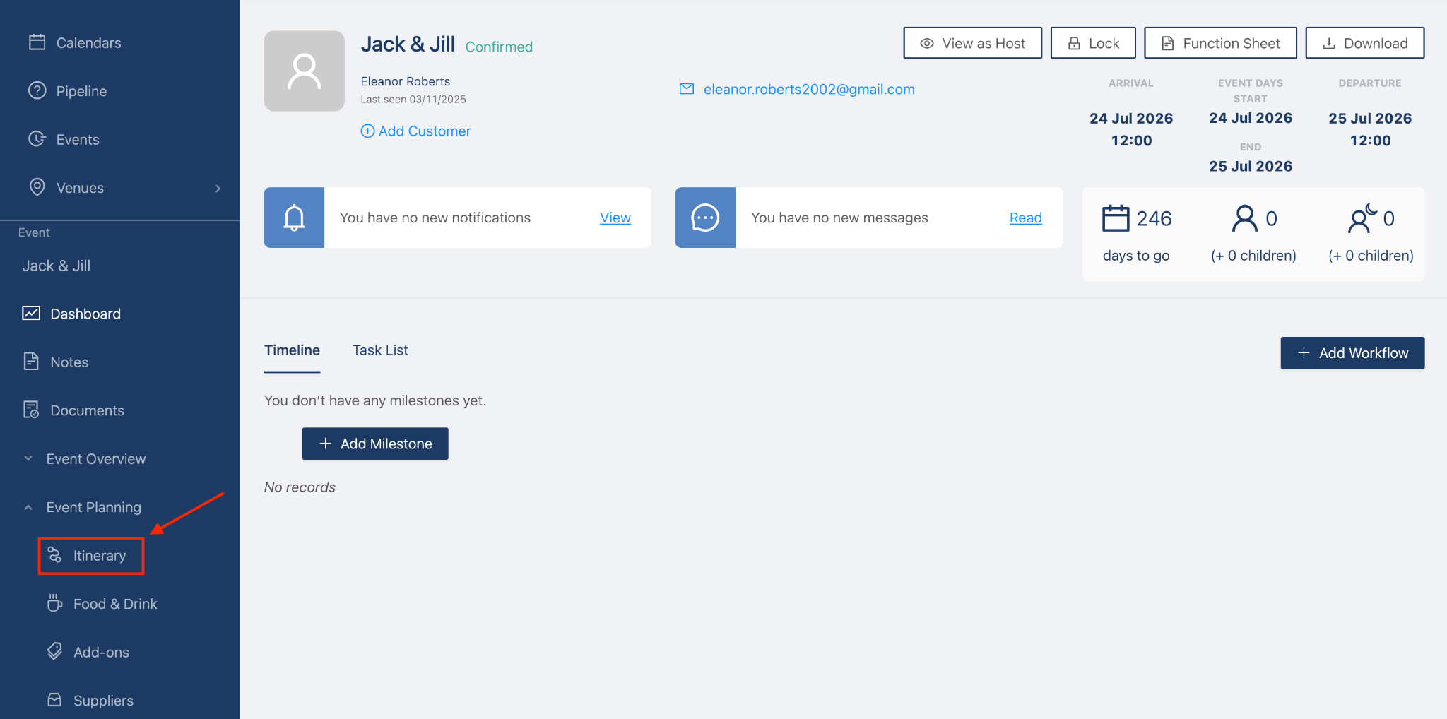 - When you are on your relevant Event, in the panel on the left-hand side, in the ‘Event Planning’ dropdown, there is a section titled 'Itinerary'