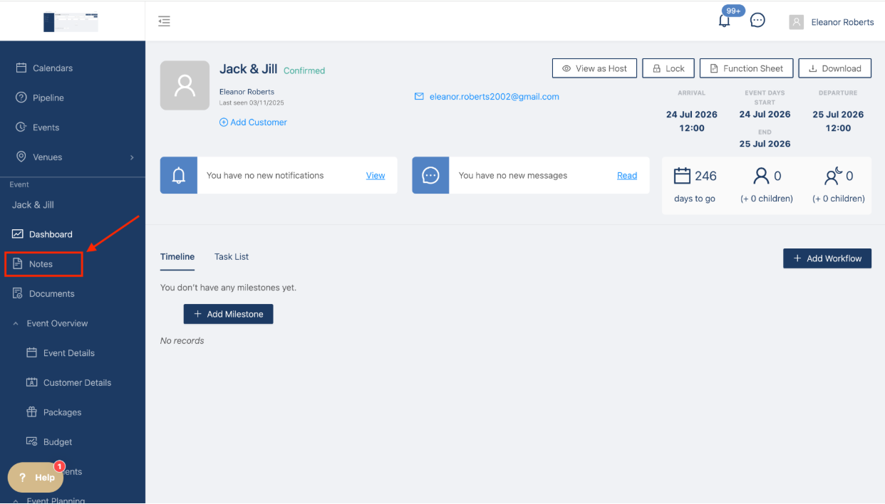 - As seen above, when you are on your relevant Event, in the panel on the left-hand side, there is a section titled ‘Notes”