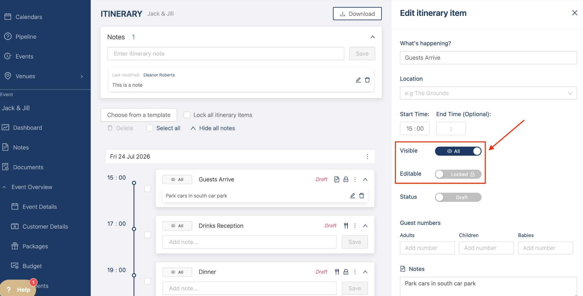 - When in the ‘Itinerary’ section of your event, as well as adding general itinerary notes, as seen above, you can add operational notes to specific sections of the itinerary