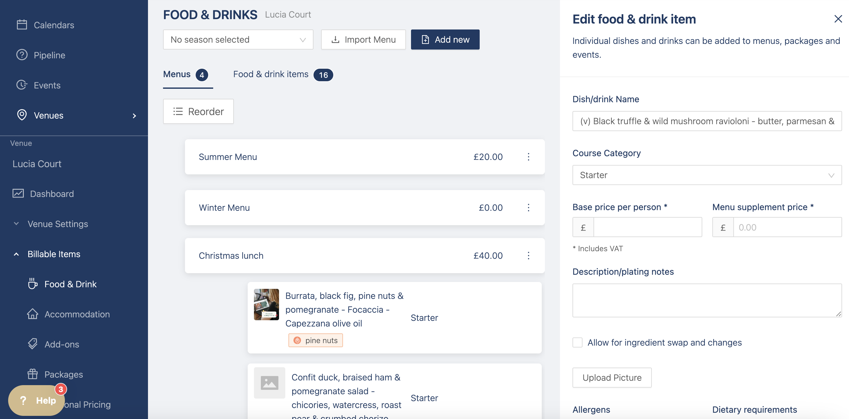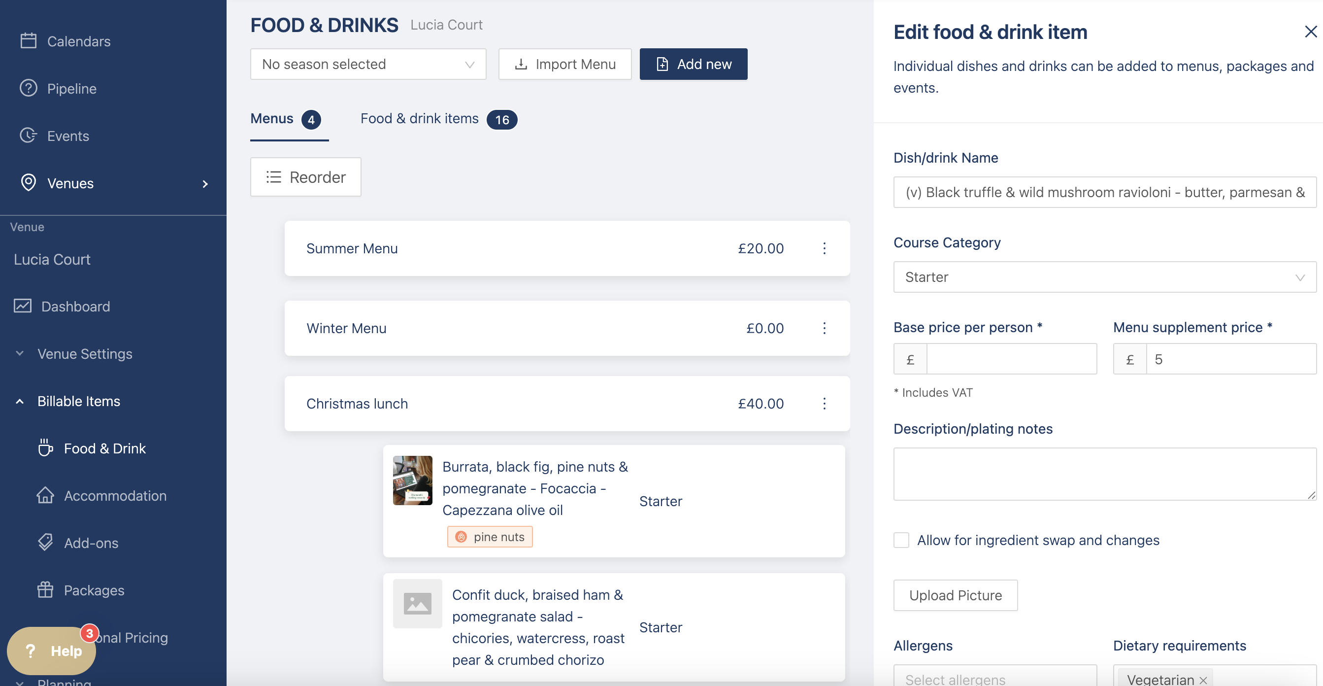 To set it up, go to your venue section, then into the food & drink, and click on the three dots to edit the item and add a supplement.