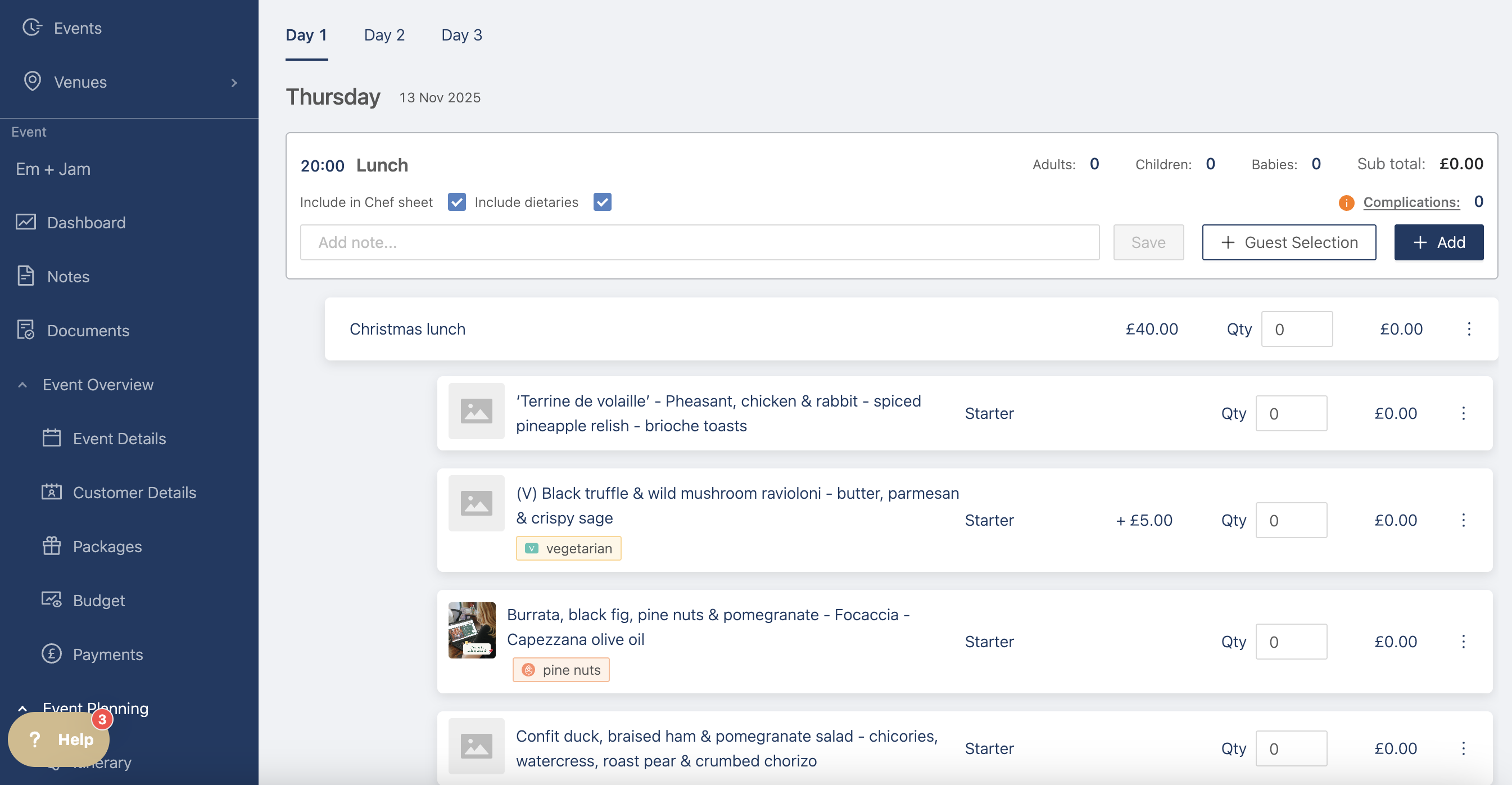 To add them to your events head to the Food & Drink section and select your menu. Both you and your host will be able to see which item has the supplement, so your hosts are also are of the extra cost for that item.
