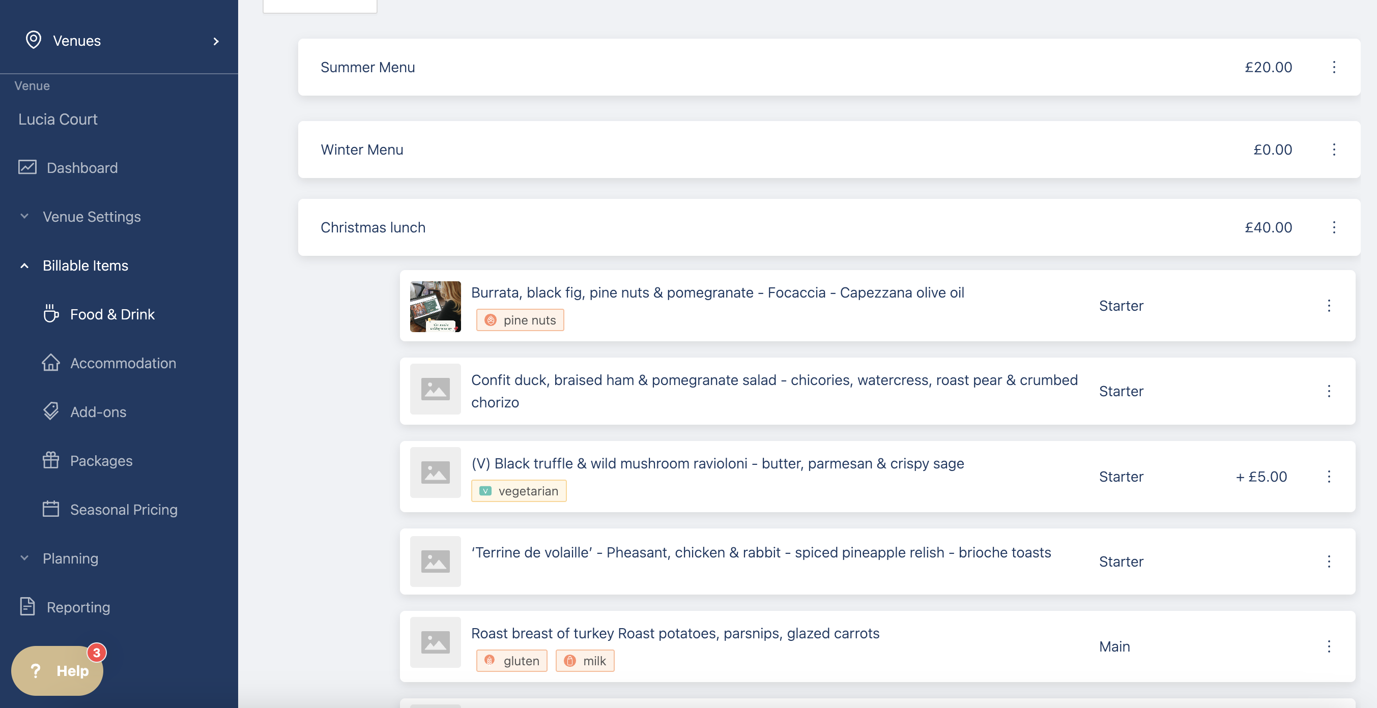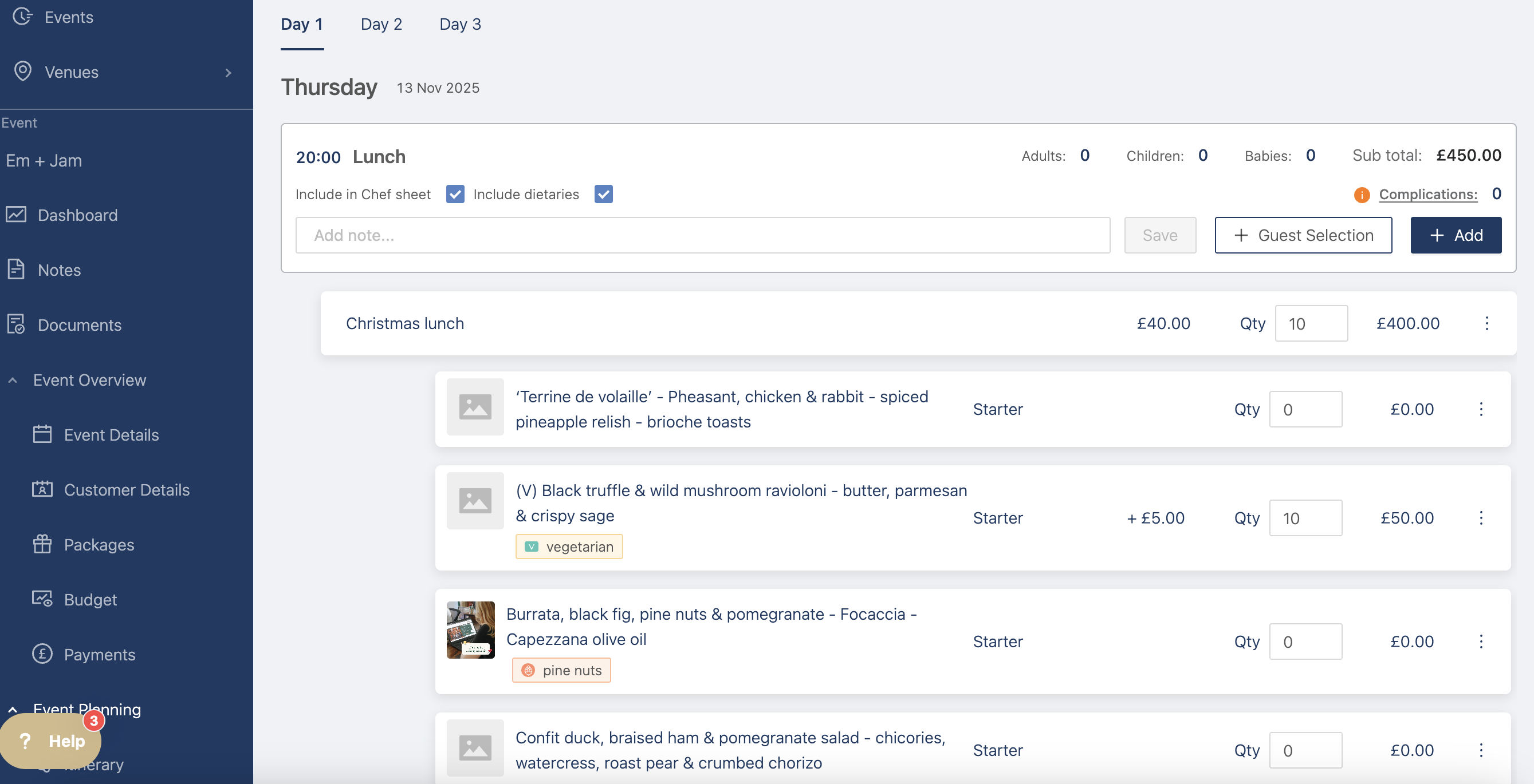 This is an helpful feature, as it enables you to add extra amounts on top of menu prices for specific items. Therefore, if you have set menus, but want to charge guests more for picking certain items on the menu, you are able to do this, and it will automatically be shown in the budget.
