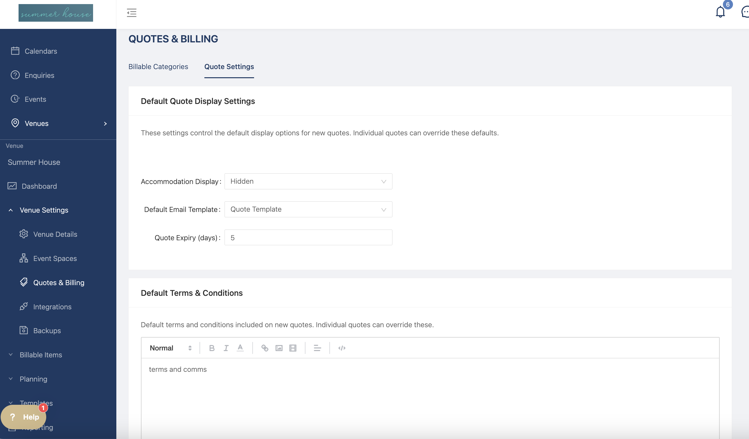 Change the settings to display accommodation, the default email template, and quote expiry days.