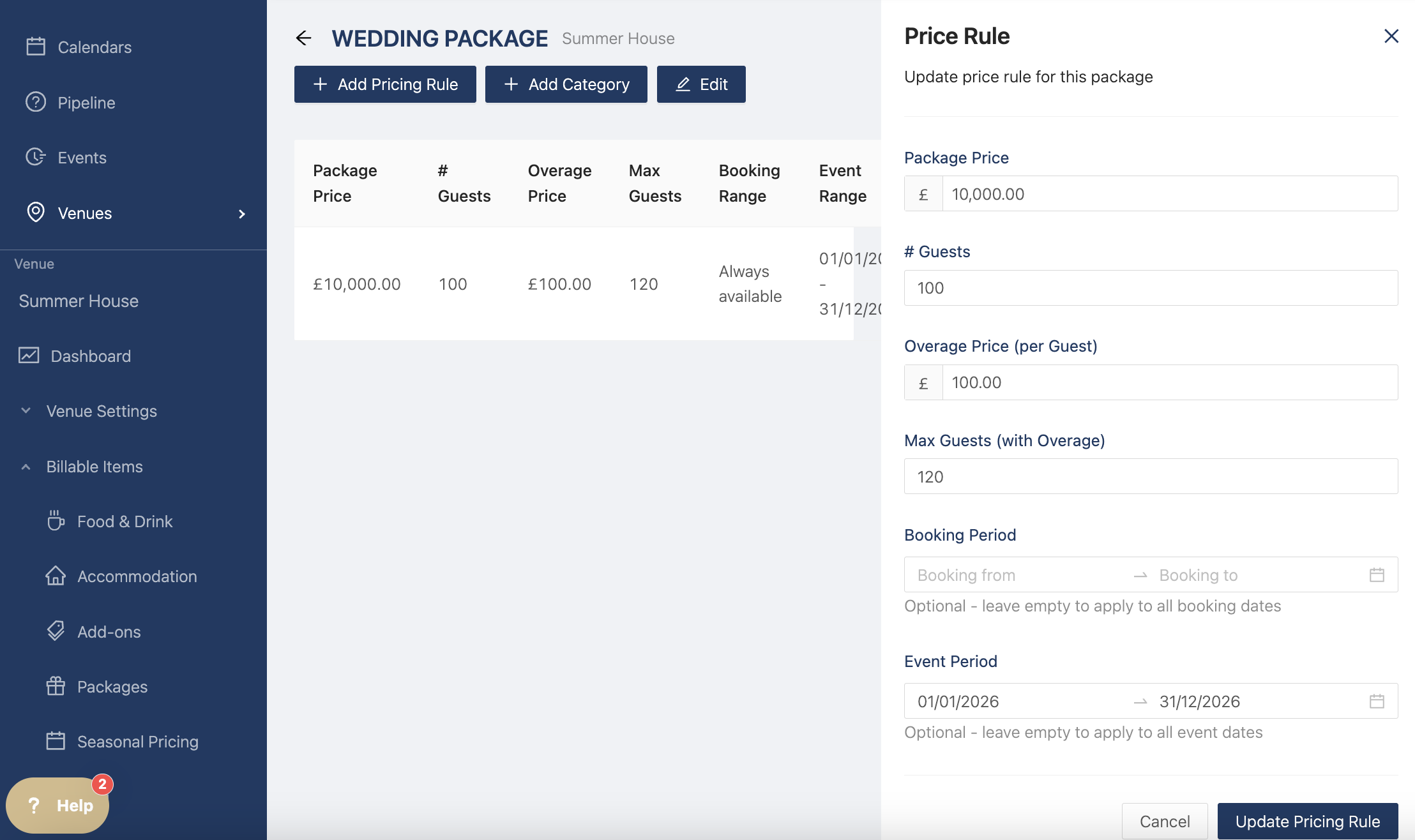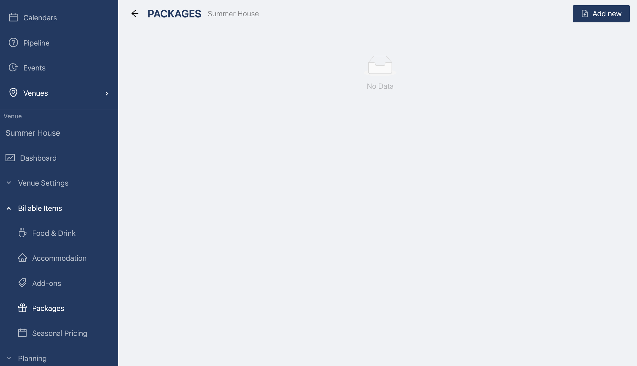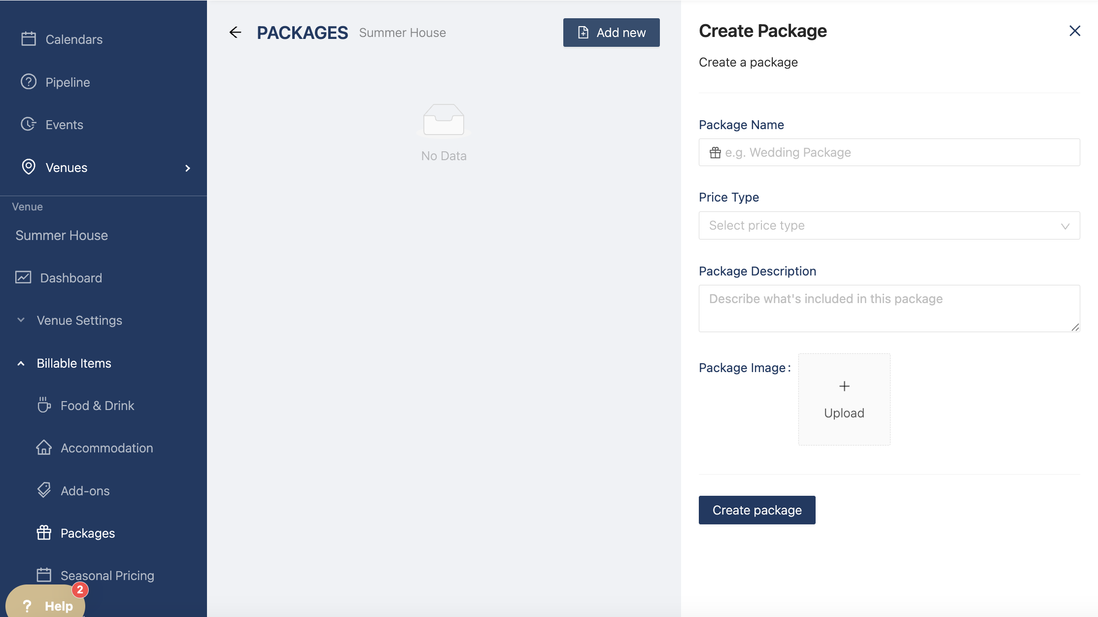 To create a package, go to the venue section, under billable items, and select "Packages". Click on "Add new" at the top right to start creating your first package. A drawer opens so you can give your package a name, a price type (eg price per package or price per person), a description, and an image.