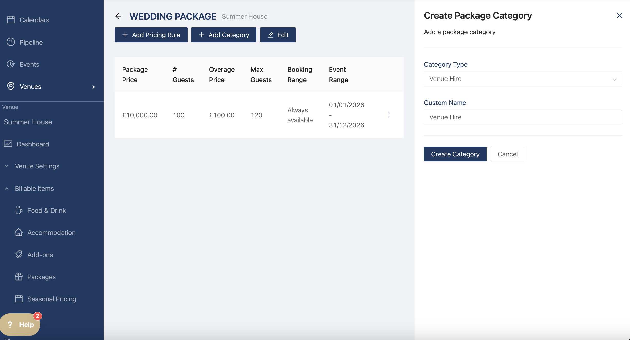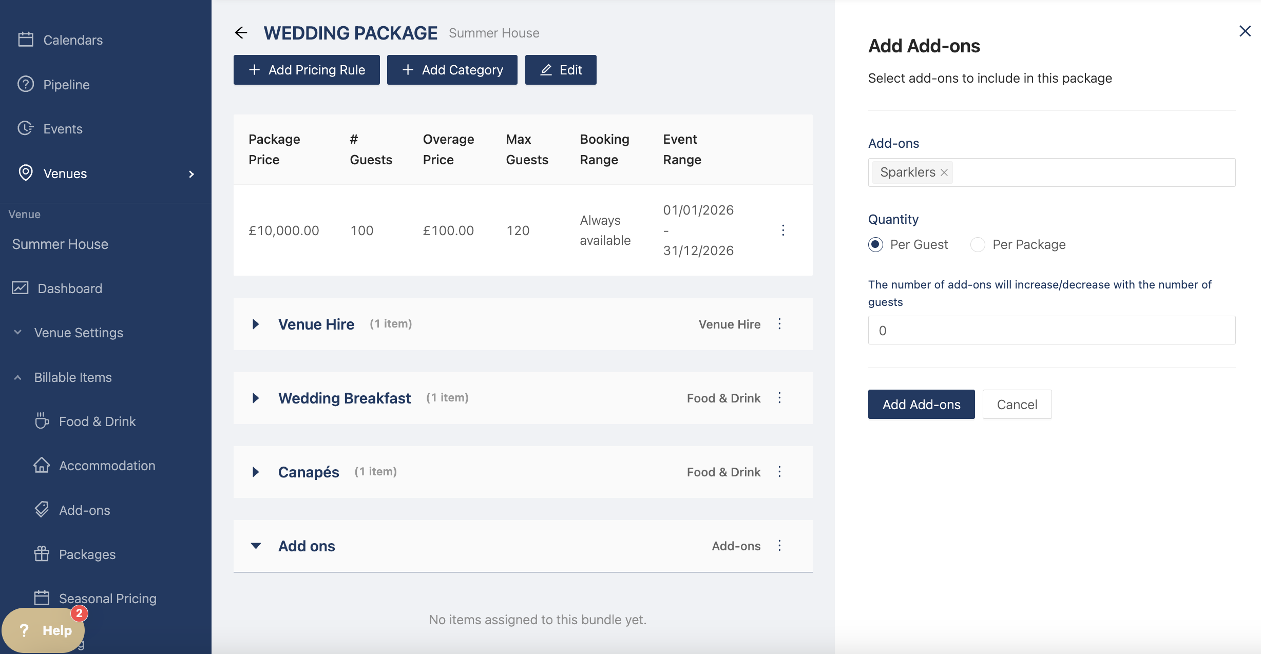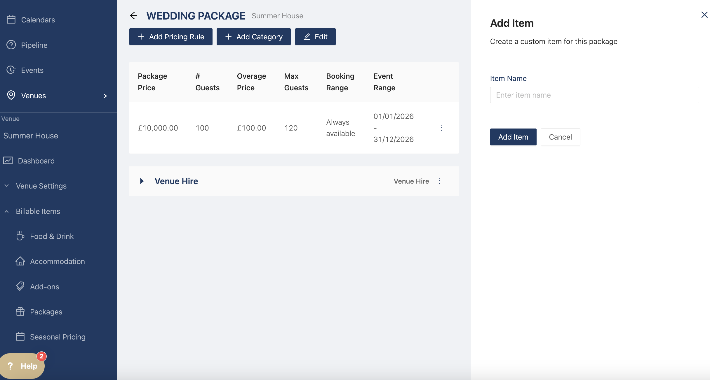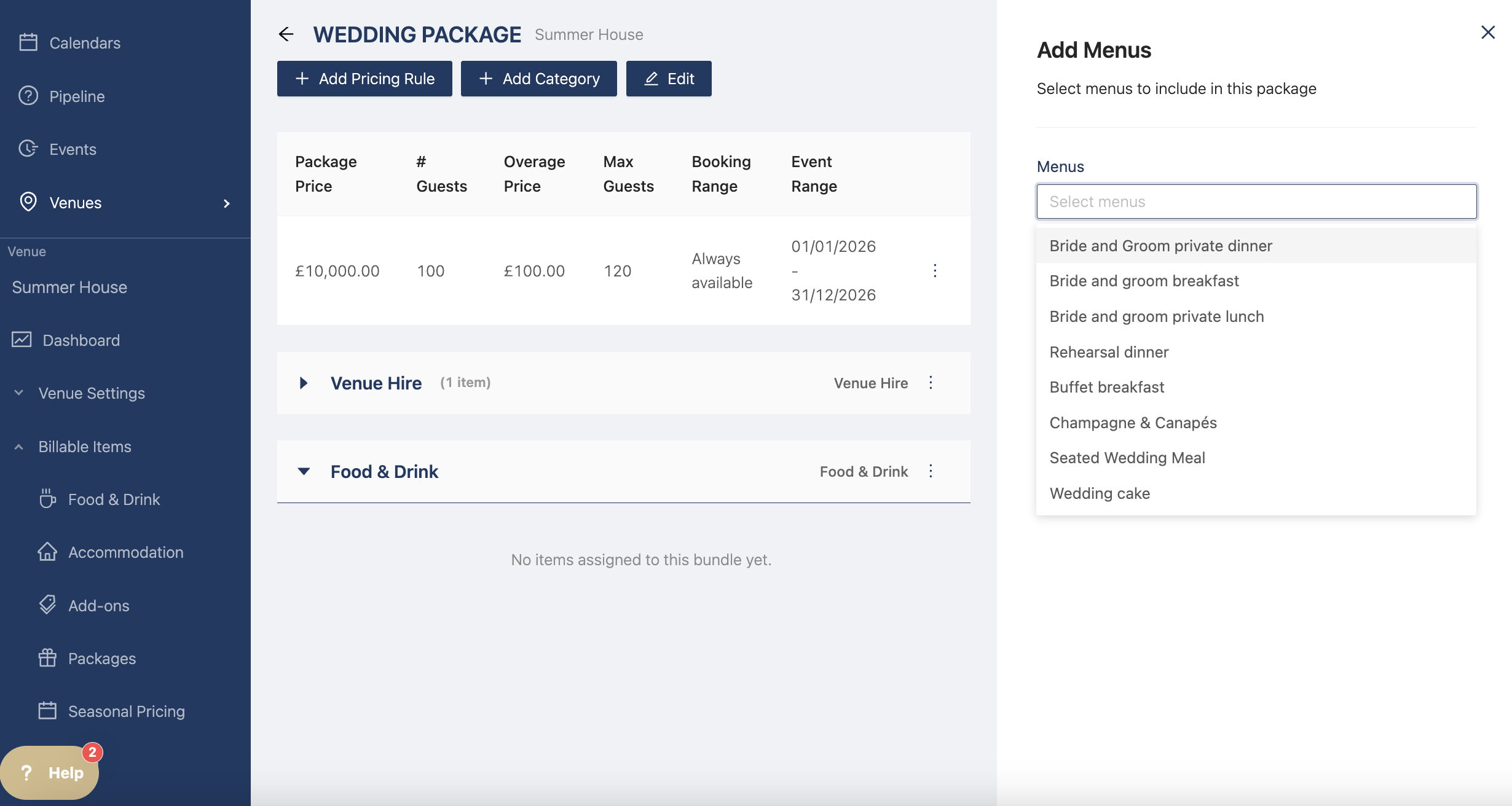 Now you can add your billable items by clicking "Add Category". The drawer opens and you can select the category types (Venue Hire, Food & Drink, Accommodation, Add Ons, and Additional Items)