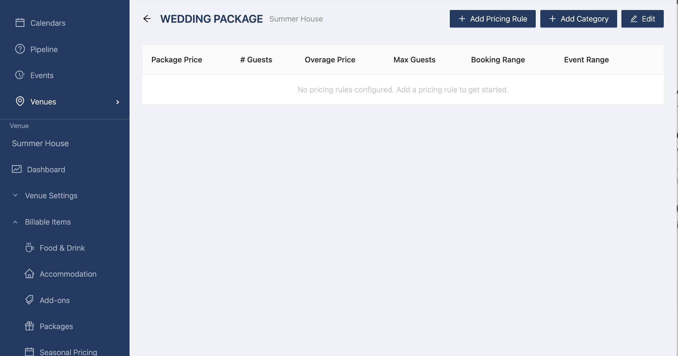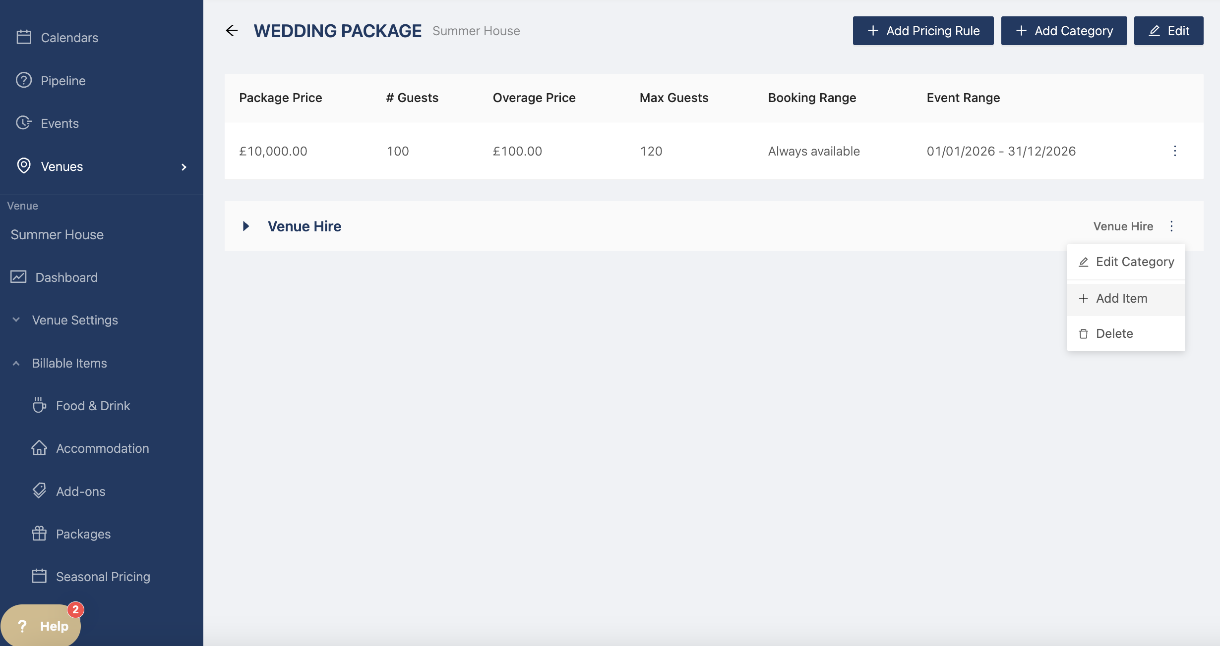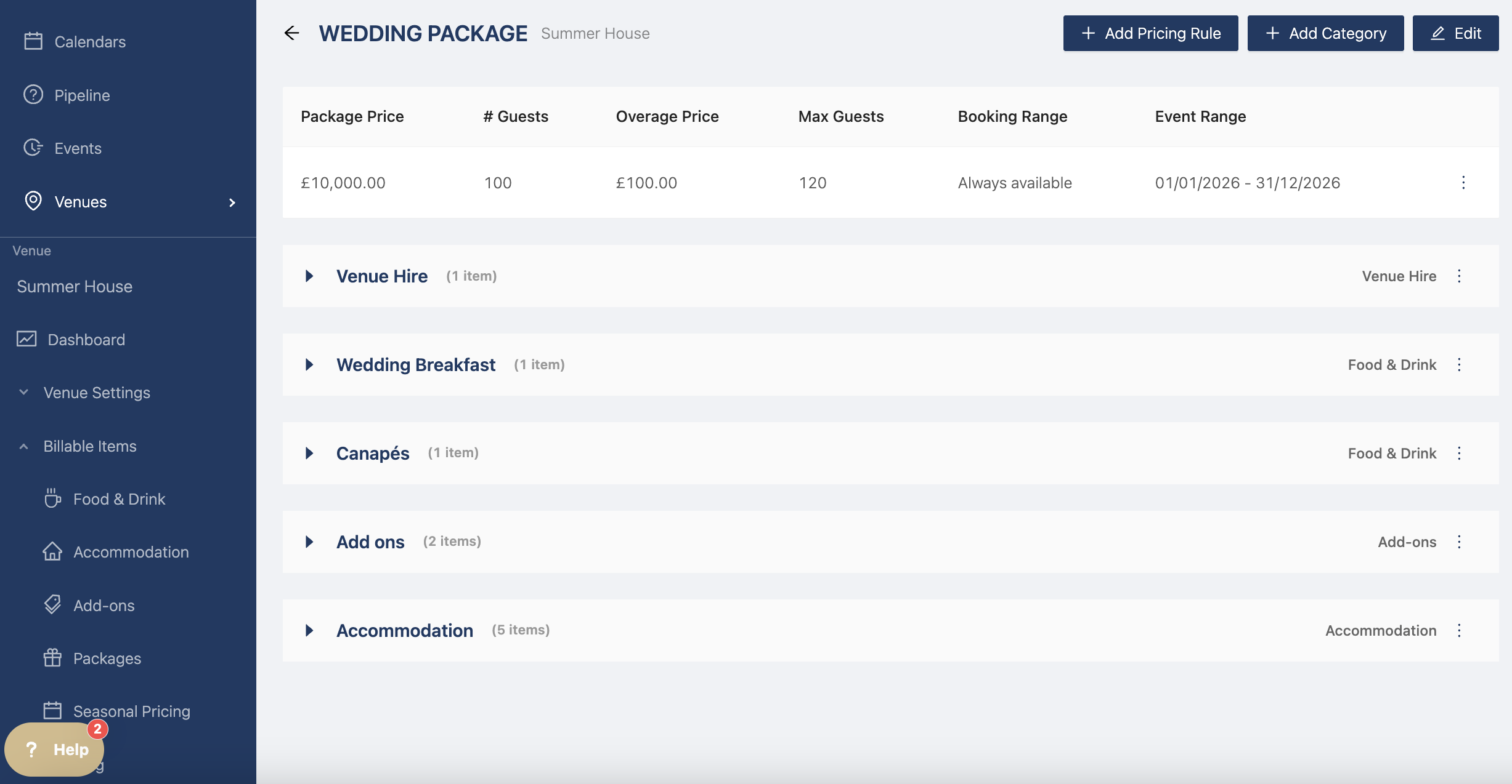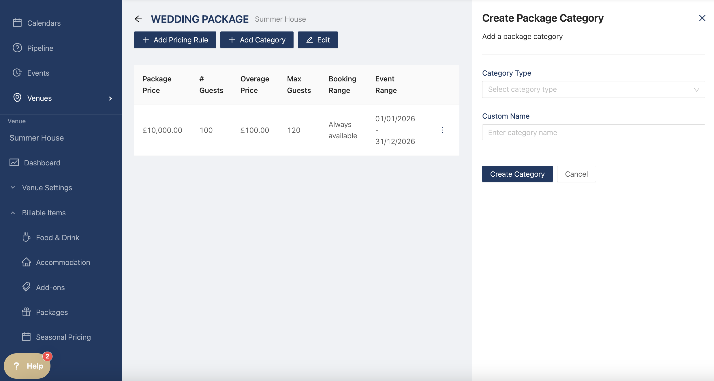Now you can add your billable items by clicking "Add Category". The drawer opens and you can select the category types (Venue Hire, Food & Drink, Accommodation, Add Ons, and Additional Items)