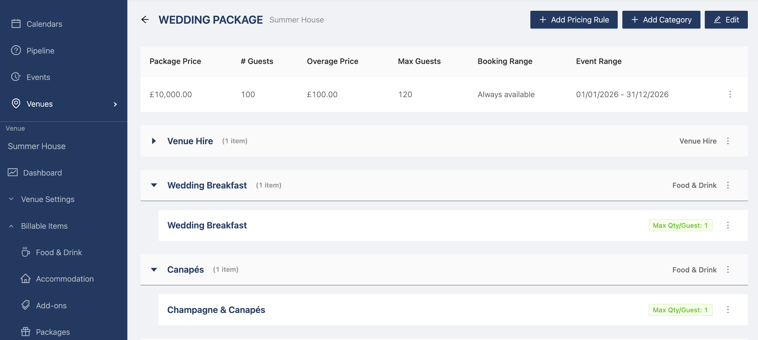 For Food & Drink, remember to create different categories if you want to apply them to different itinerary items. For example, you can create a Wedding Breakfast category and a Canapés category to apply them to their respective itinerary items.