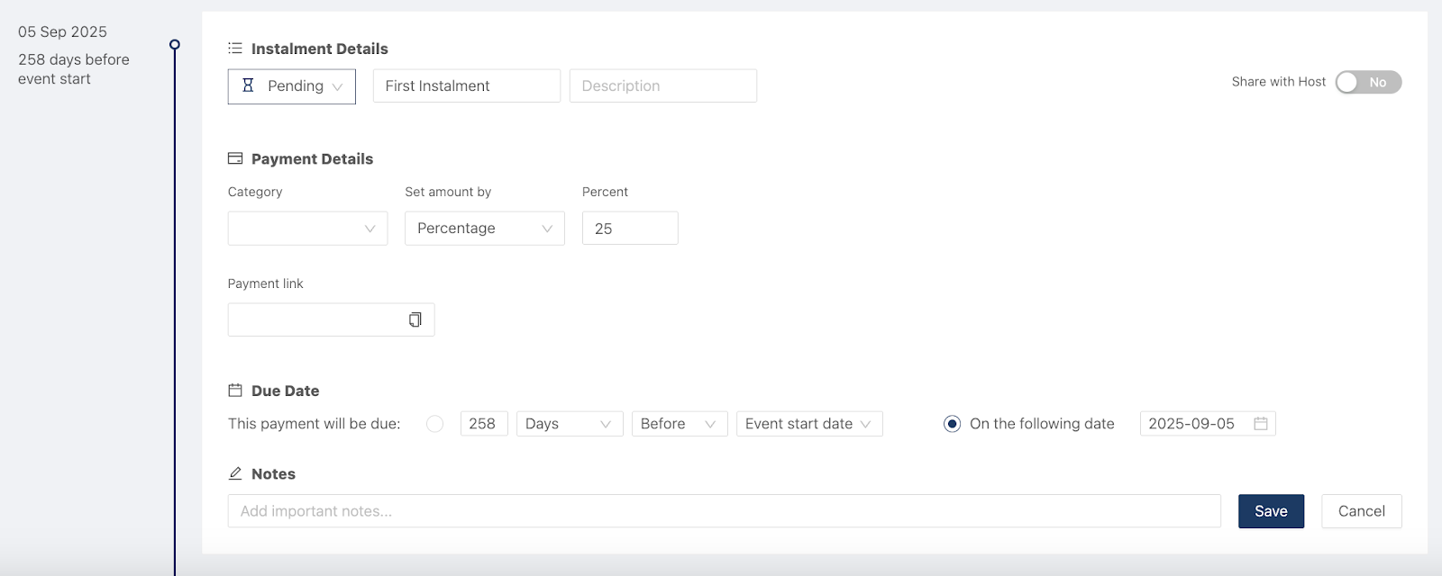 Add a description, notes, or make changes to the due date if needed. You can also share the instalment with your hosts so they can see when payment is due.