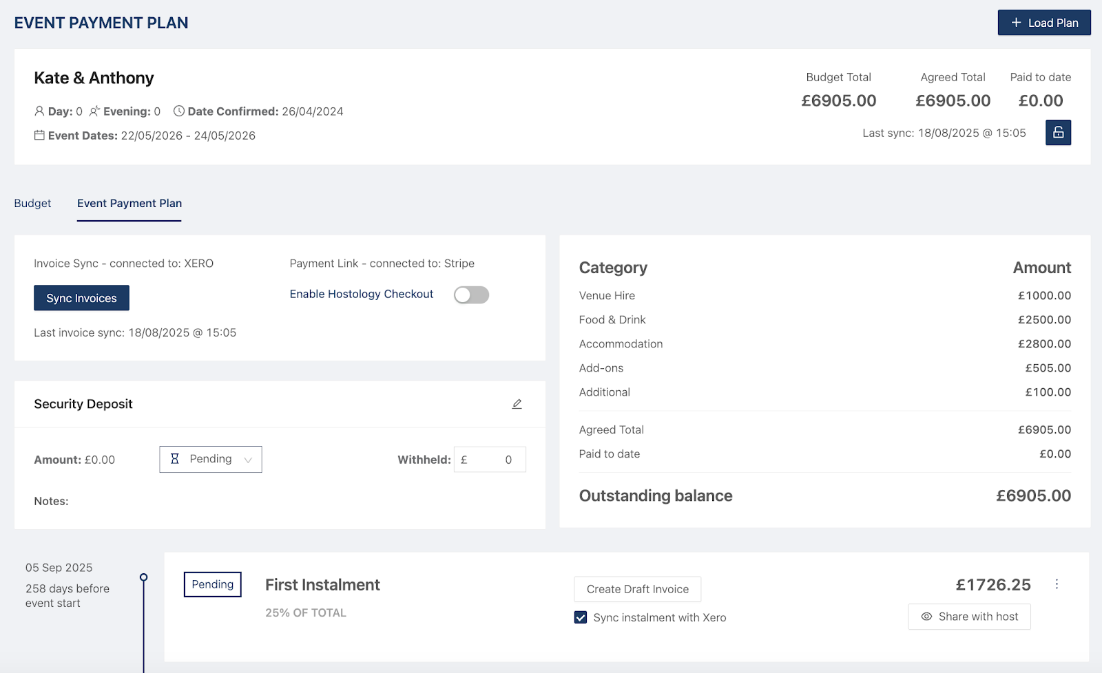 To add a payment template to your event, go into the event, into the Payments section and click "Load Plan" at the top right. The payment template will import and automatically work out the amounts and dates.