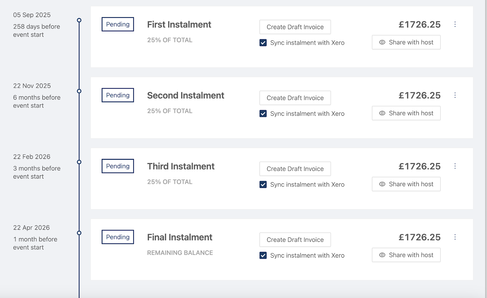 Create invoices and share instalments with hosts with the click of a button.