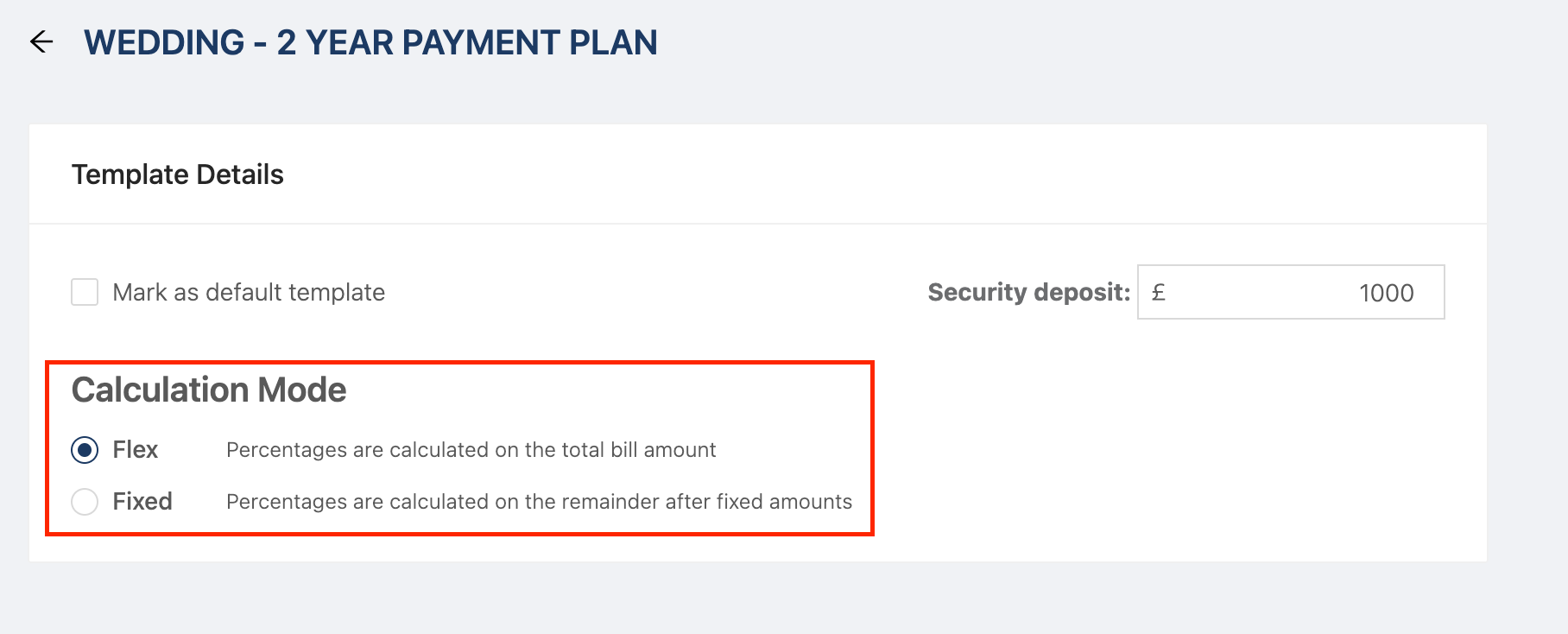 You can choose how installments are calculated in these payment plans. There are two calculation modes - Fixed or Flex