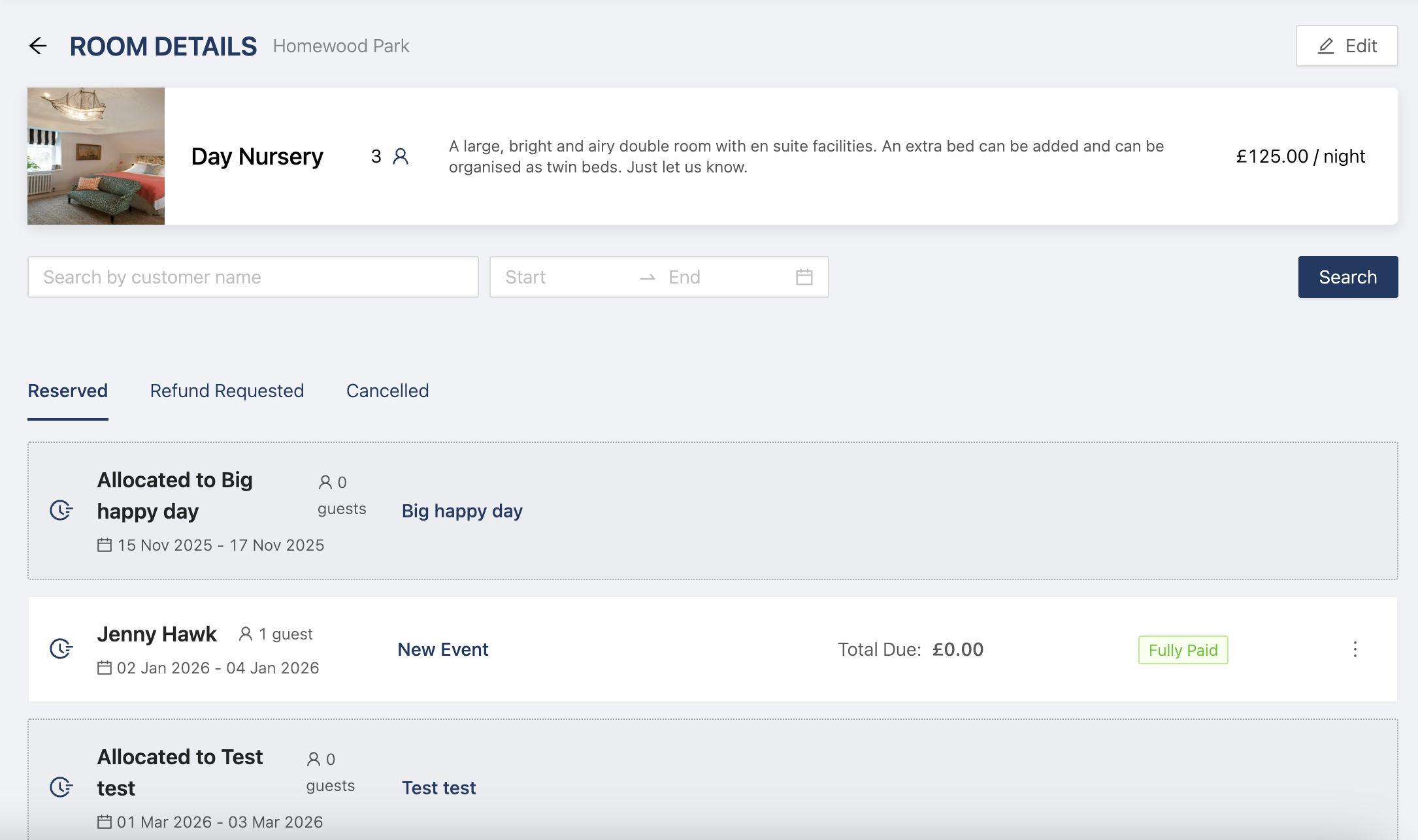 To do this, simply head to Venue > Billable Items > Accommodation and click on any of your rooms to see all the events it's assigned to as well as the guests. You can the access the events that the room is asssigned to by clicking on the event name.