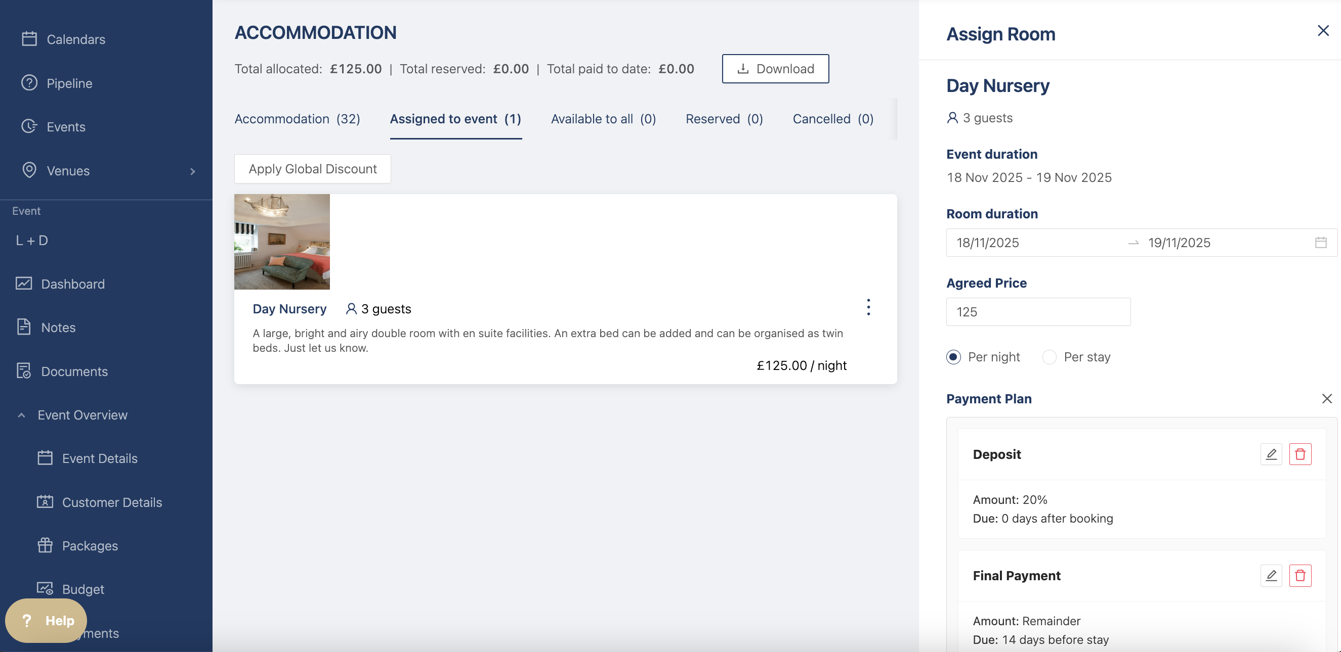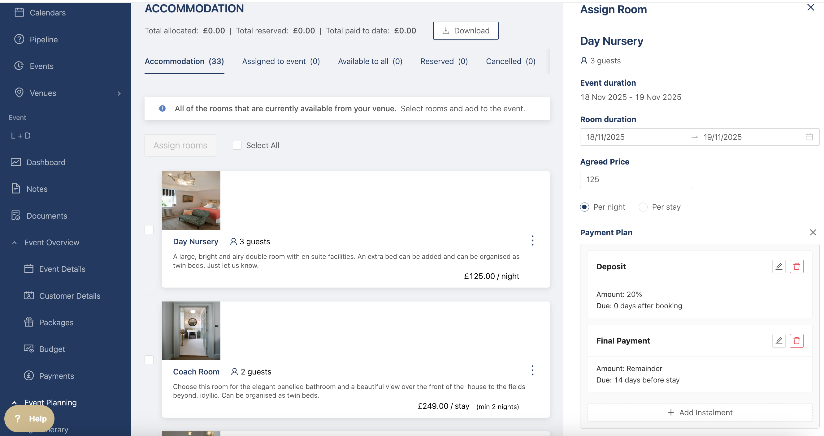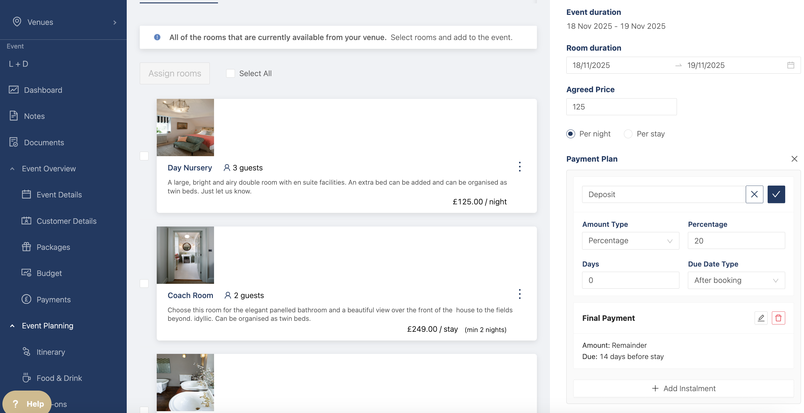 When you're happy with the changes, click on assign room and the room will be added to the event. Once it's assigned you can always edit the payment plan.